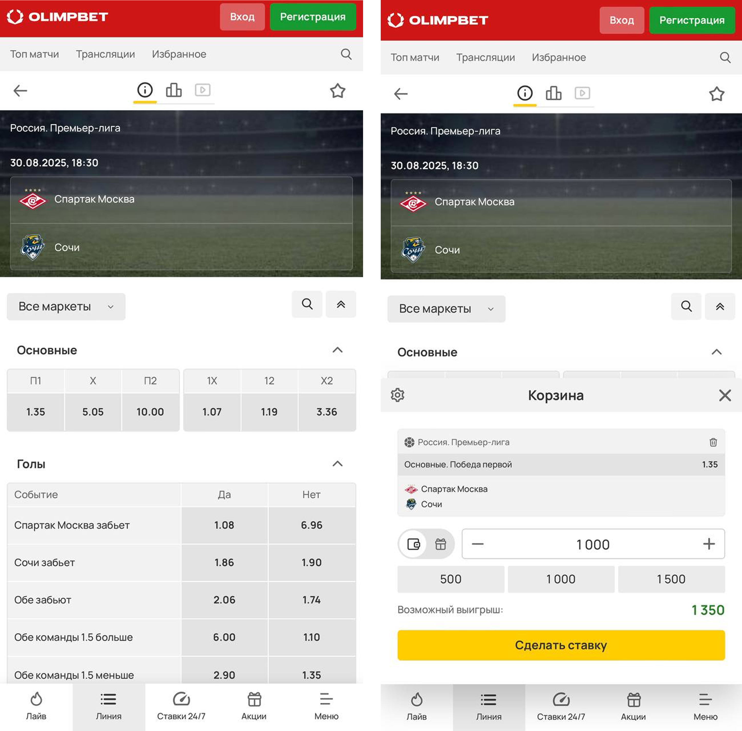 Пример: допустим, игрок собирается сделать ставку в матче «Спартак» – «Сочи», на победу москвичей букмекер дает коэффициент 1.35, а вот на победу сочинцев – 10.00.