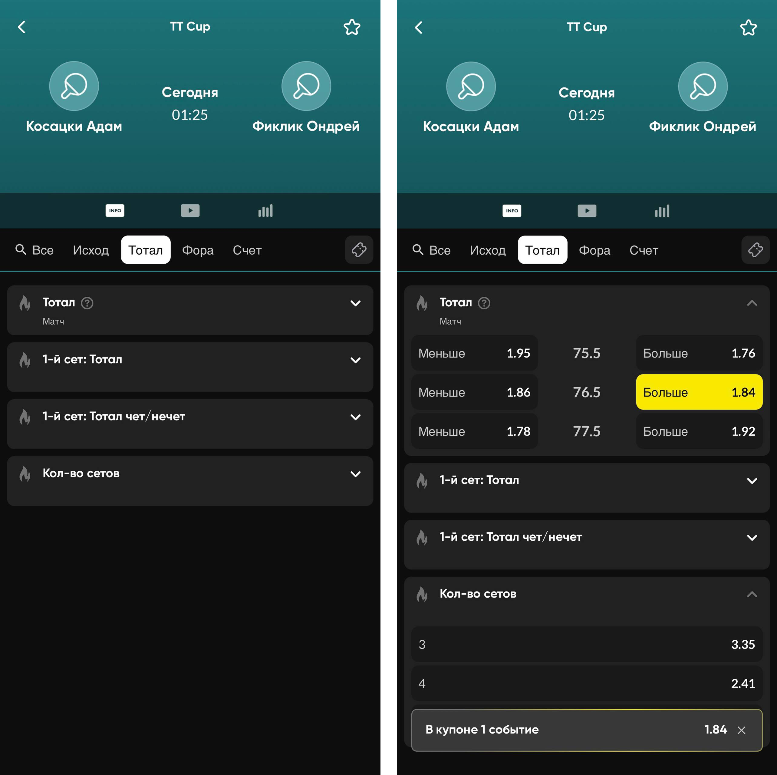 Тотал — это ставка на общее количество очков или сетов, которые будут набраны за матч. В настольном теннисе можно делать ставки на тотал как в рамках всего матча, так и на каждый сет отдельно.