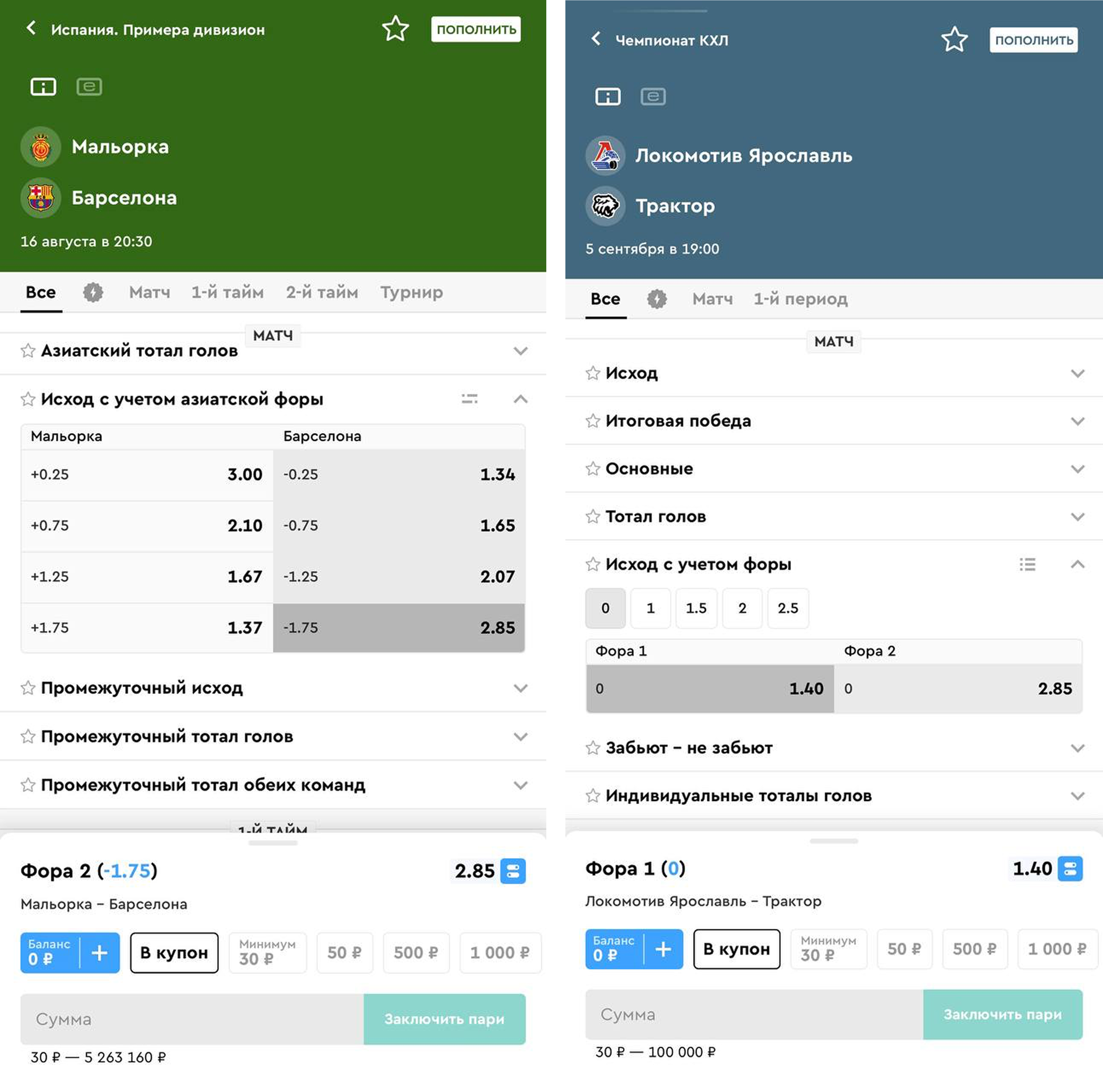 Азиатская фора. И снова футбол: матч «Мальорка» – «Барселона». Каталонцы считаются фаворитами. Букмекер предлагает азиатскую фору (-1,75) на гостей. Исходя из того, что это азиатская фора, половина суммы идет на фора (-1,5), а вторая половина – на фору (-2). Расчет каждой из частей идет по отдельности, и здесь возможны следующие варианты. Для победы необходимо победа «Барселоны» с разницей в 3 мяча. Если же разница в 2 мяча, то половина ставки выигрывает, а именно фора (-1,5). А вот по форе (-2) идет возврат. Если же «Барса» выиграет с минимальной разницей, сыграет вничью или вовсе проиграет, то обе ставки проиграют.