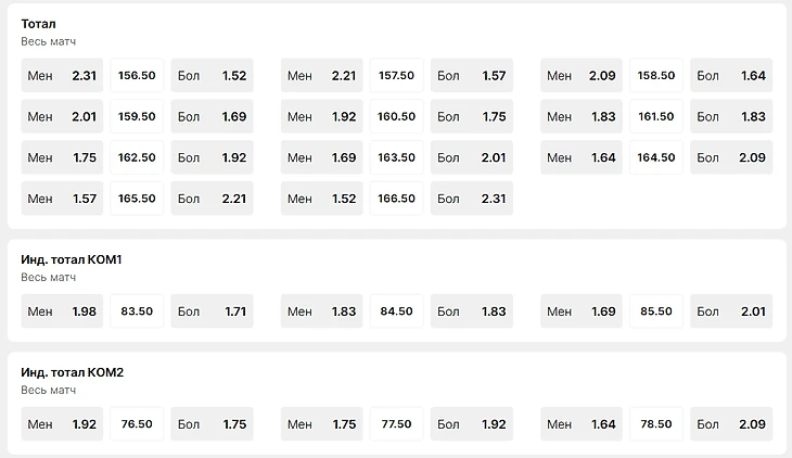 Основных разновидностей тотала две: «тотал больше» (ТБ) и «тотал меньше» (ТМ). Если вы ставите на ТБ, то предполагаете, что команды наберут в сумме больше указанного букмекером значения. Если же ваш выбор – ТМ, то вы считаете, что итоговый счет будет ниже предложенной отметки. Например, если тотал установлен на 180,5, то при ставке на ТБ вам нужно, чтобы команды набрали 181 очко или больше, а при ставке на ТМ – 180 очков или меньше. Выглядит в линии у букмекеров следующим образом:
