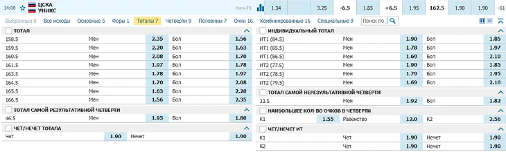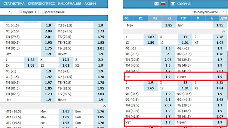 Пример: в матче между командами «А» и «Б» счет после третьей четверти 68:64. Вы предполагаете, что в четвертой четверти команды будут играть осторожно, и итоговый счет матча останется четным. Вы делаете ставку на «чет». Если итоговый счет окажется, например 82:78, ваша ставка выиграет.