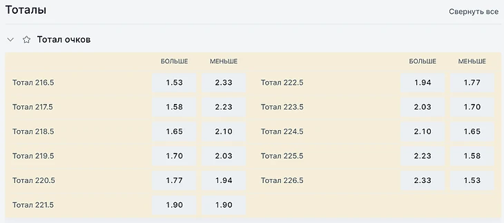 Несмотря на то, что коэффициент на это событие может быть ниже, чем в начале матча, вероятность его прохода увеличивается. Ведь букмекер изначально не просто так установил средний тотал на уровне 49,5 очков, основываясь на статистике и опыте.