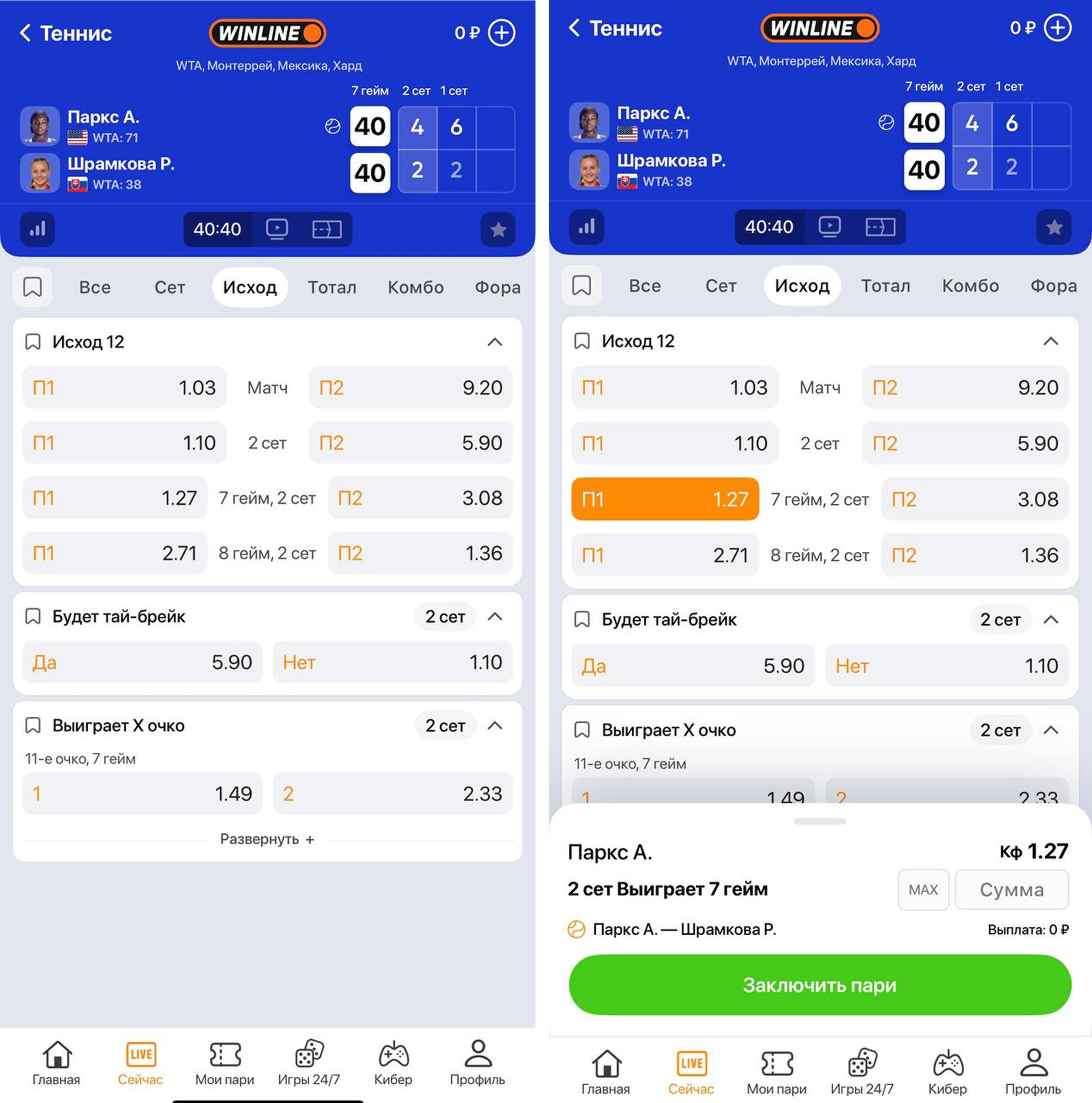 Лайв-ставки дают больше гибкости, но требуют быстрой реакции и хорошей интуиции. В прематче у пользователя есть больше времени на обдумывание, но никогда не знаешь, как поведут себя теннисисты в конкретный день и в конкретном матче. На это соответственно реагируют и коэффициенты.