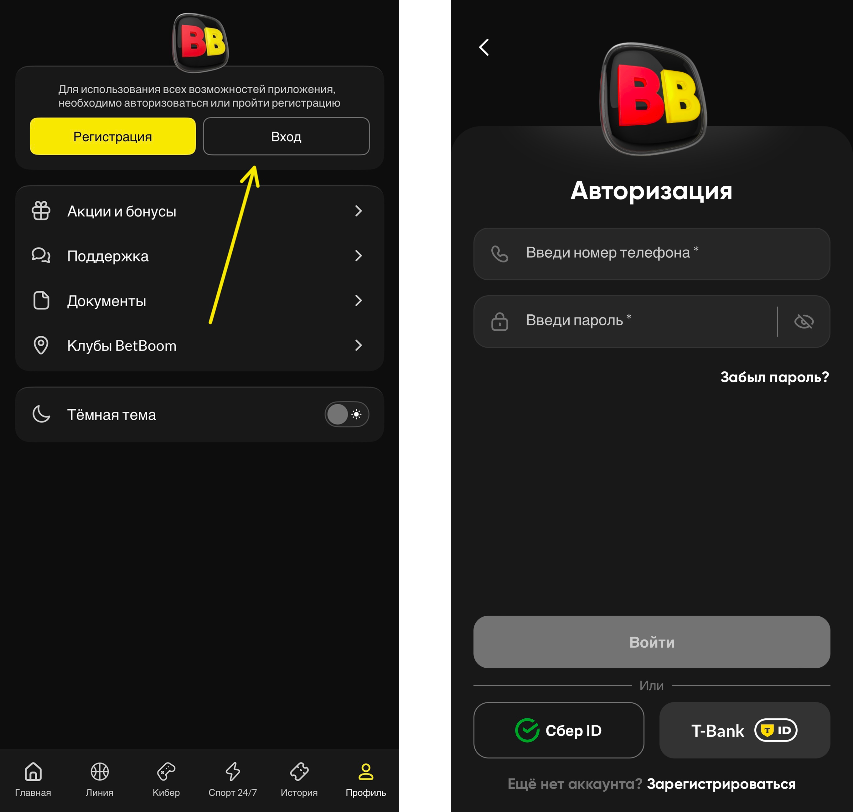 — Нет, авторизоваться в BetBoom получится только по номеру телефону и паролю, которые были указаны при регистрации.