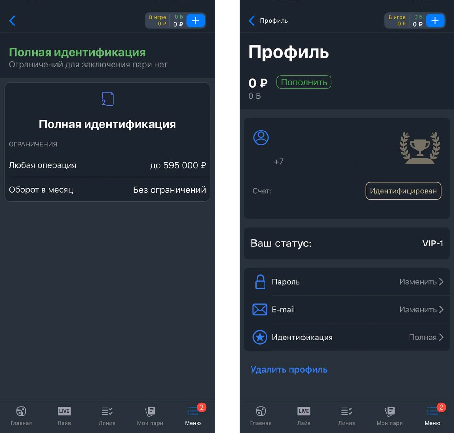Букмекерская контора предлагает два типа идентификации: упрощенную и полную.