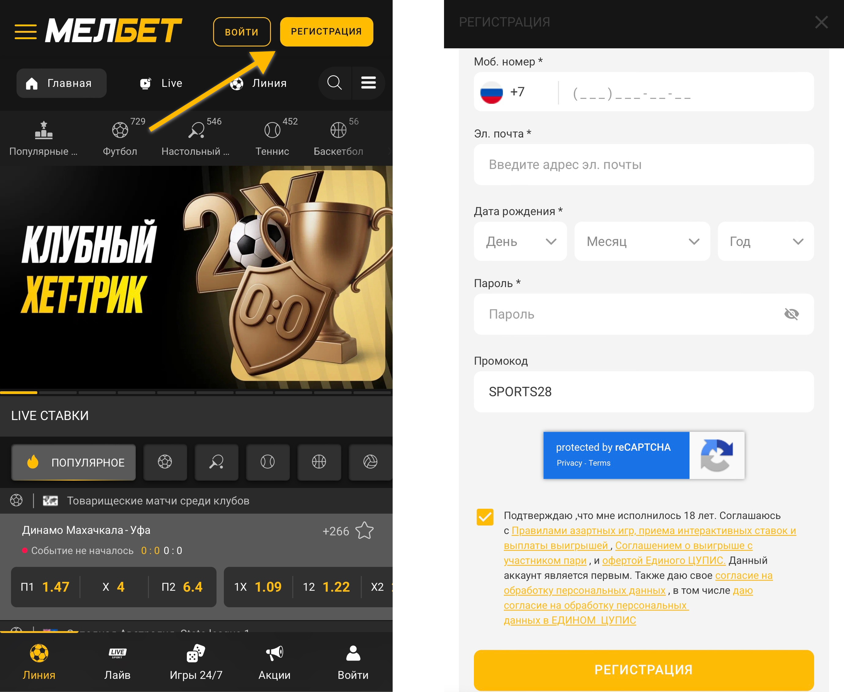Заполните анкету, предоставив необходимую информацию, такую как ФИО, пароль, дата рождения, номер телефона и промокод (при наличии).