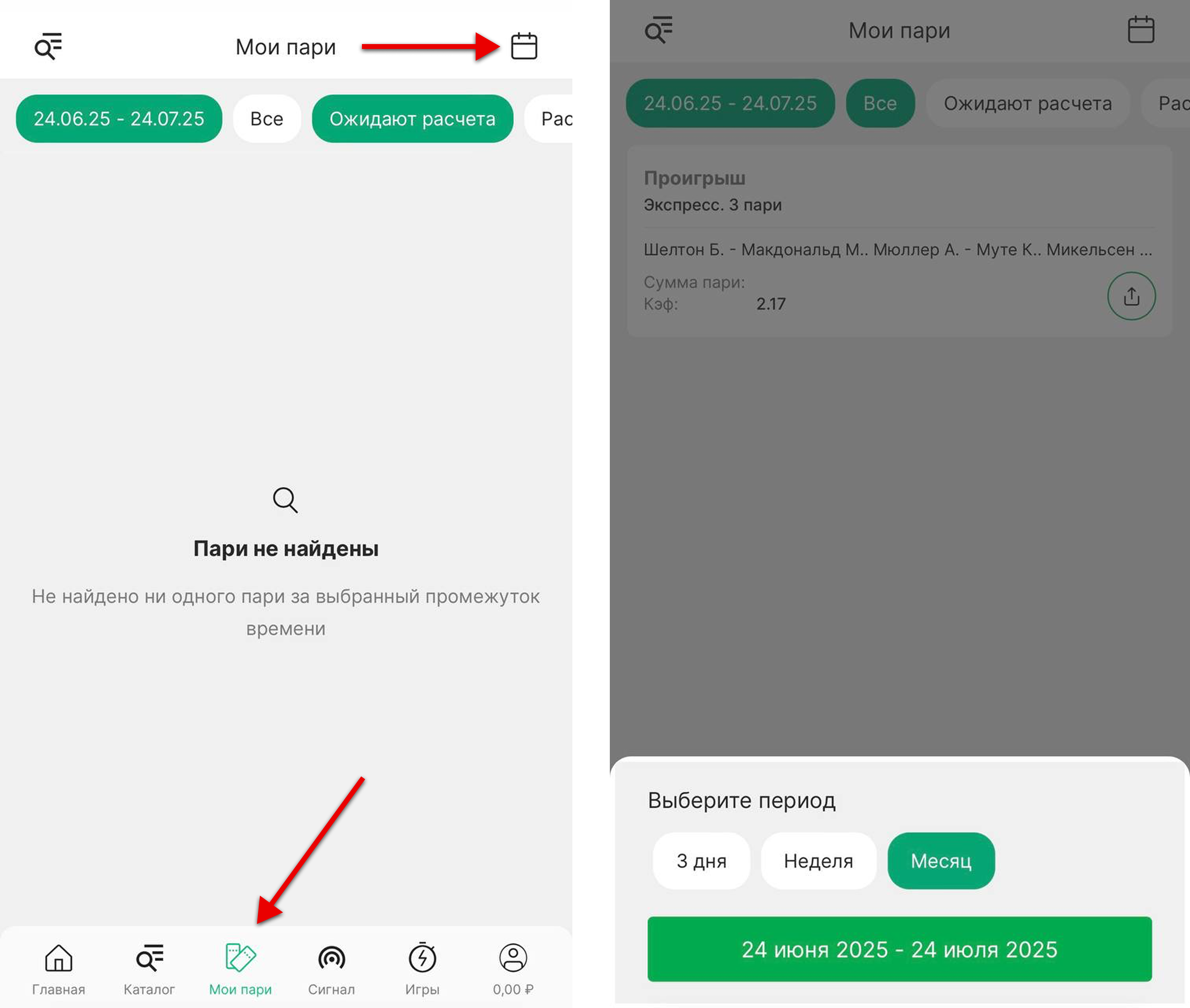 В этом разделе можно увидеть все ваши пари за выбранный период игры в букмекерской компании.