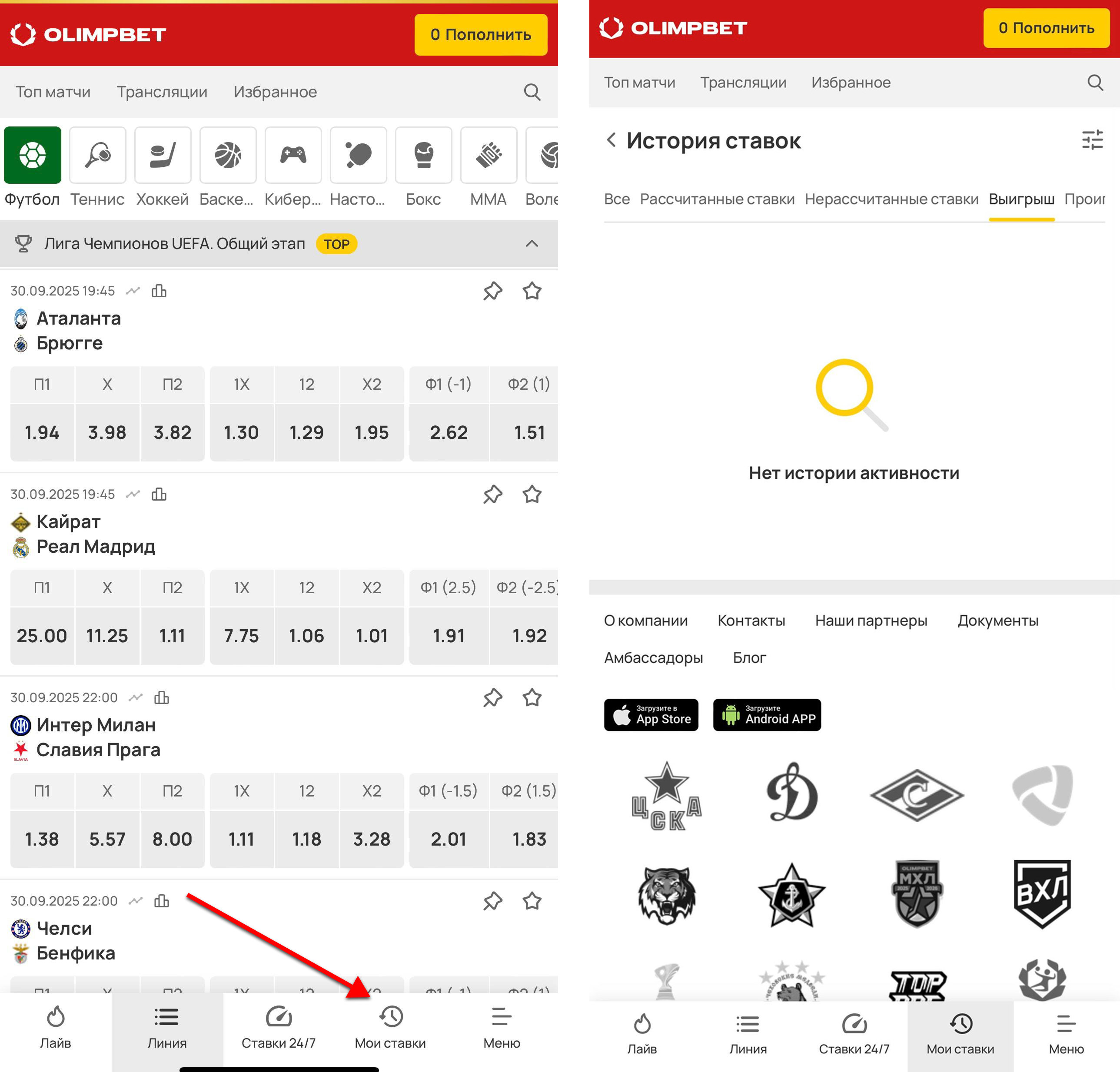 История ставок в БК OLIMPBET