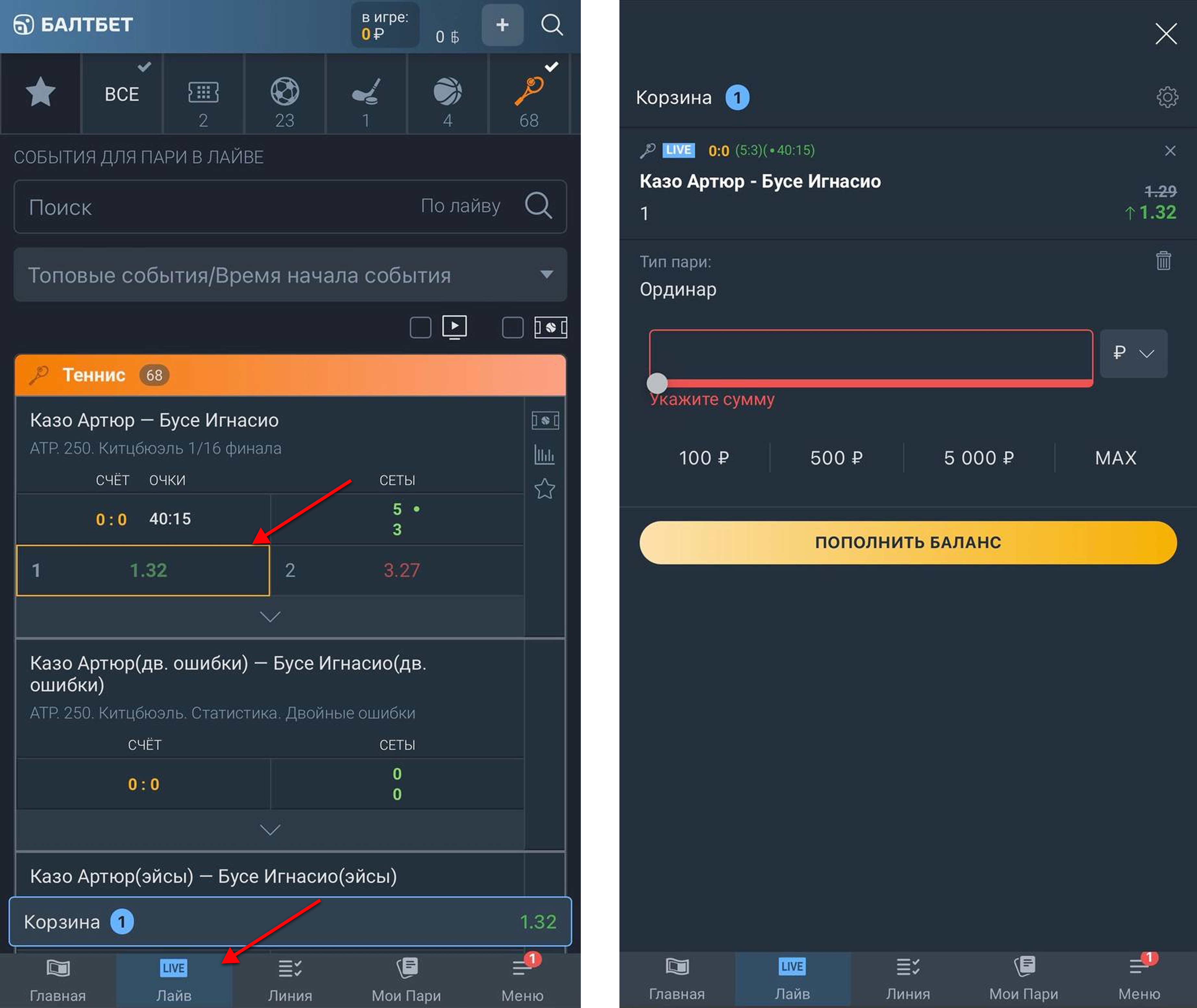 Чтобы сделать ставку в формате live на официальном сайте «Балтбет», выполните следующие действия: