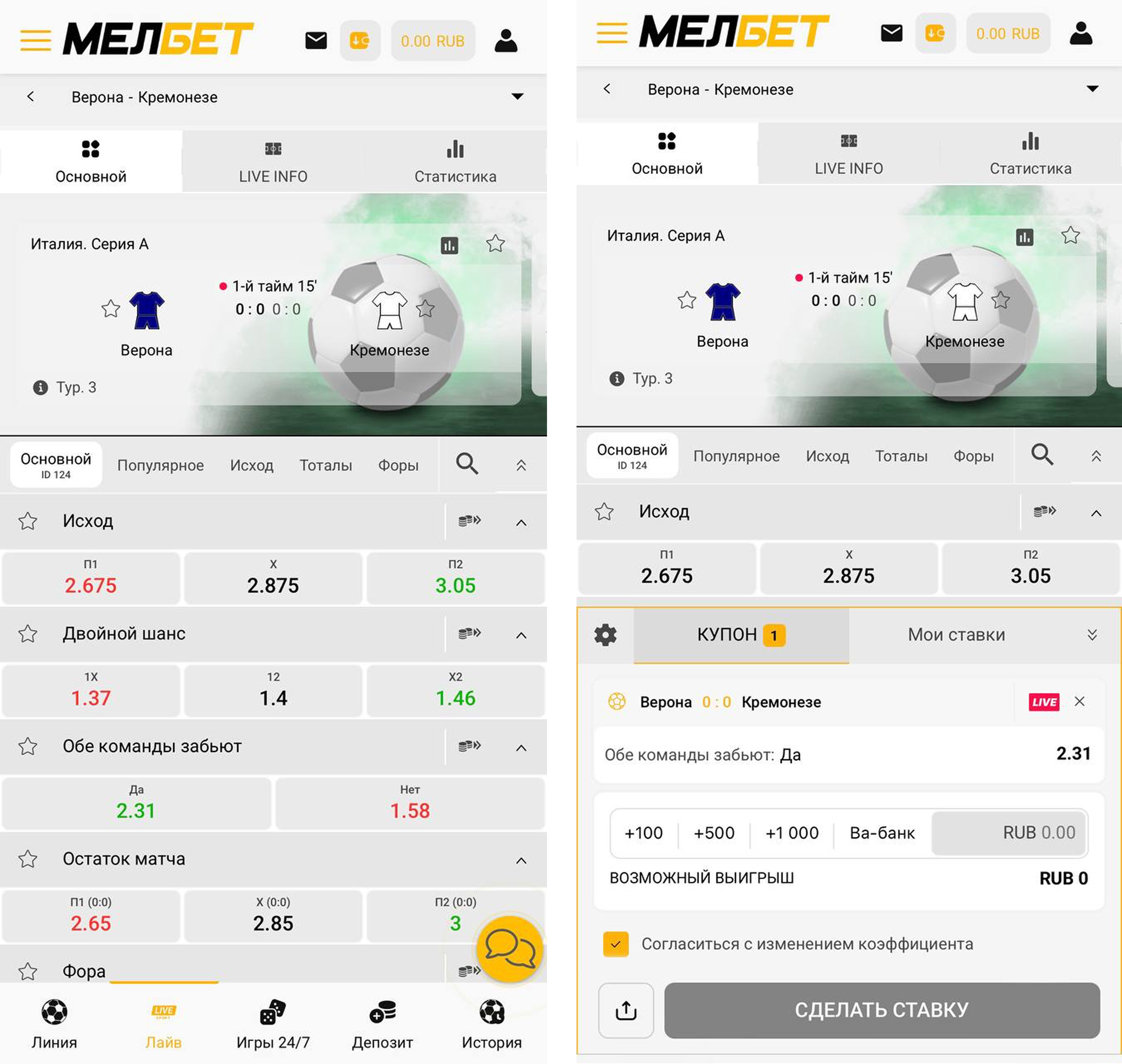 Мелбет позволяет игрокам настраивать параметры при изменении коэффициентов во время ставок в режиме реального времени. Вы можете мгновенно принять ставку при любой динамике коэффициентов, сделать ставку только при увеличении коэффициентов или запросить дополнительное подтверждение ставки. Также доступна функция «Ставка в 1 клик», которая позволяет быстро делать ставки на заранее заданные суммы. Недостатком этой опции является невозможность вручную установить сумму ставки. Для тех, кто предпочитает экспресс-ставки, Melbet предлагает добавлять интересующие матчи в раздел «Избранное» и отслеживать изменения результатов в выбранных поединках.