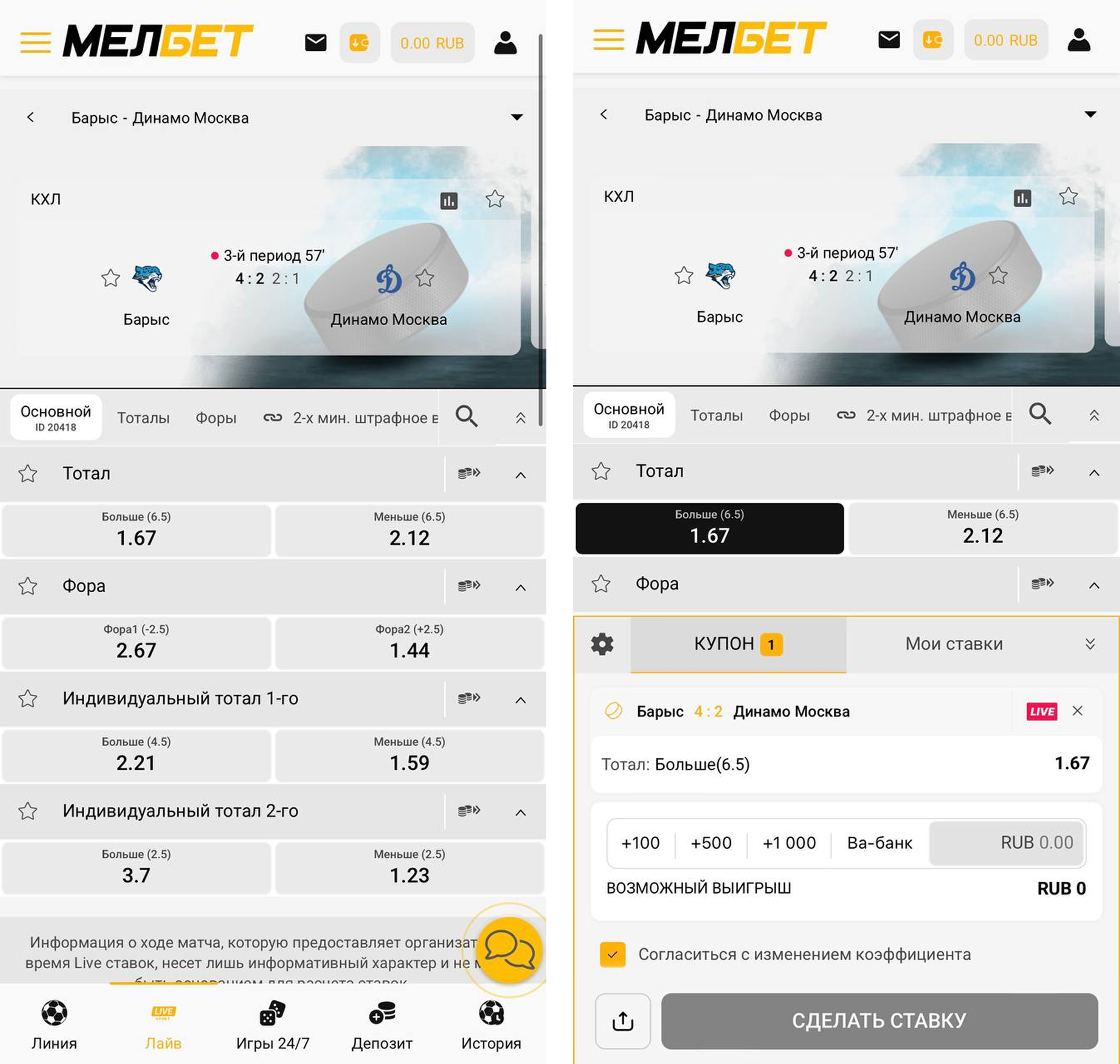 Хоккейные матчи на Melbet также широко представлены в разделе Live, где предлагаются разнообразные варианты ставок. Здесь можно делать ставки на крупнейшие чемпионаты, а также на менее известные национальные лиги Европы, включая соревнования в Швеции, Чехии, Финляндии, Беларуси и Германии. В межсезонье доступны ставки на матчи любительских команд и на мини-хоккей в формате 3х3. Варианты ставок включают исходы с учётом овертайма, тоталы, форы, точный счет и другие статистические показатели.