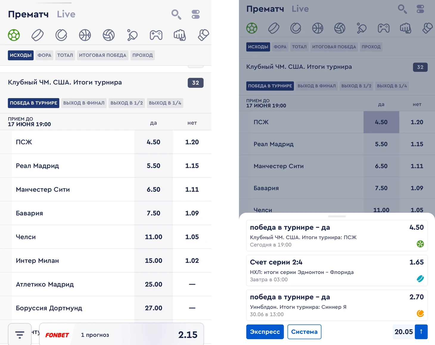 Линия Live в Фонбет