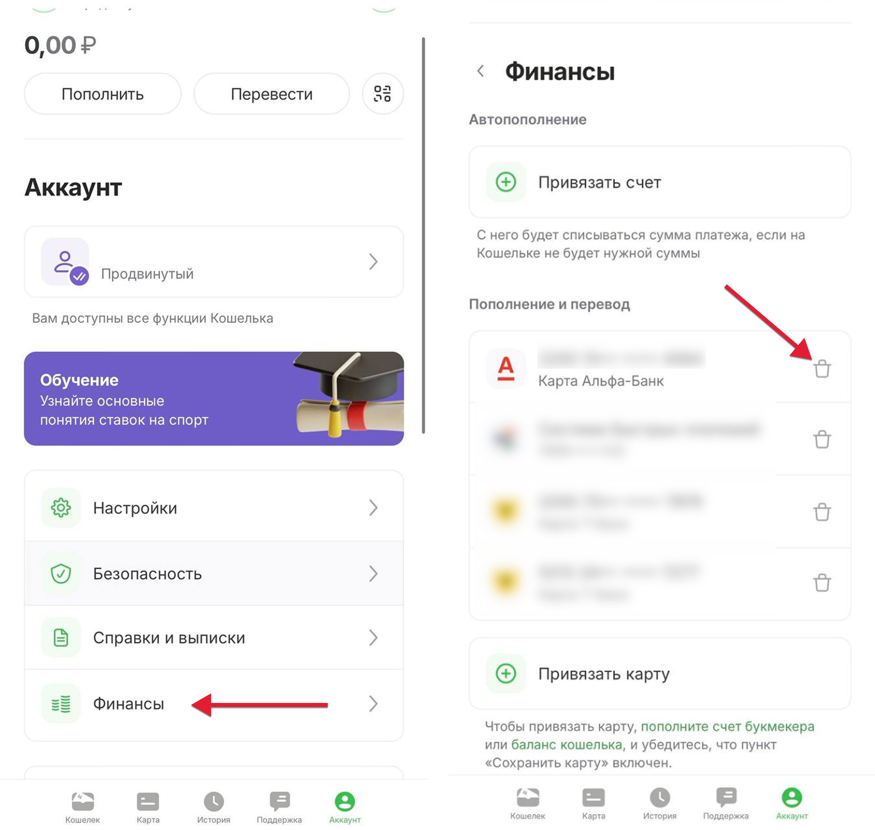 Нажмите на значок корзины рядом с привязанной картой. Это приведет к автоматической отвязке карты.