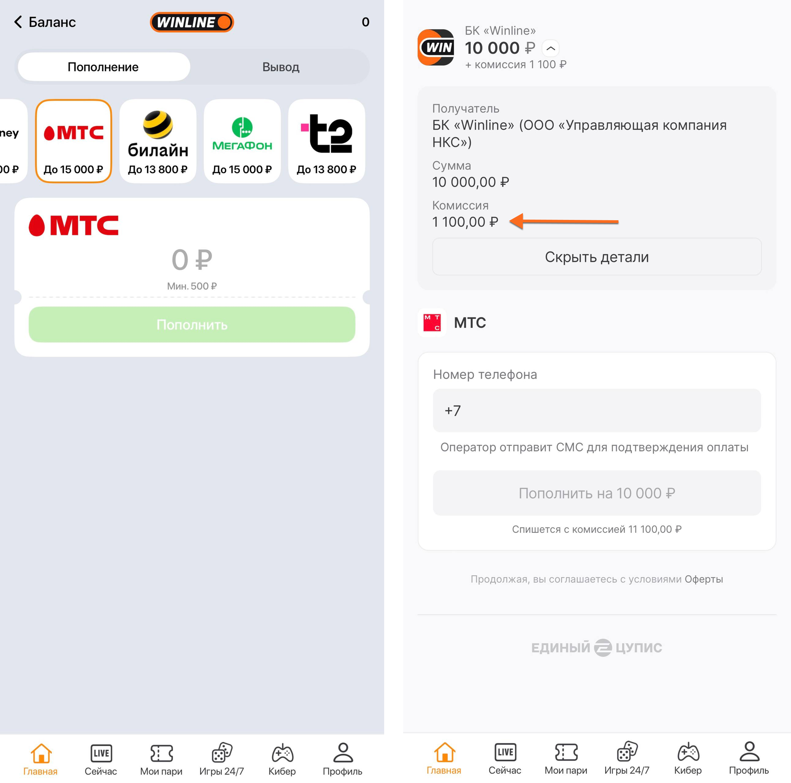Вы сможете увидеть общую комиссию после ввода желаемой суммы пополнения. Минимальная единоразовая сумма пополнения в БК составляет 500 рублей, максимальная так же зависит от оператора: у МТС и «Мегафон» – до 15 000 рублей, у «Билайн» и Т2 – до 13 800 рублей.