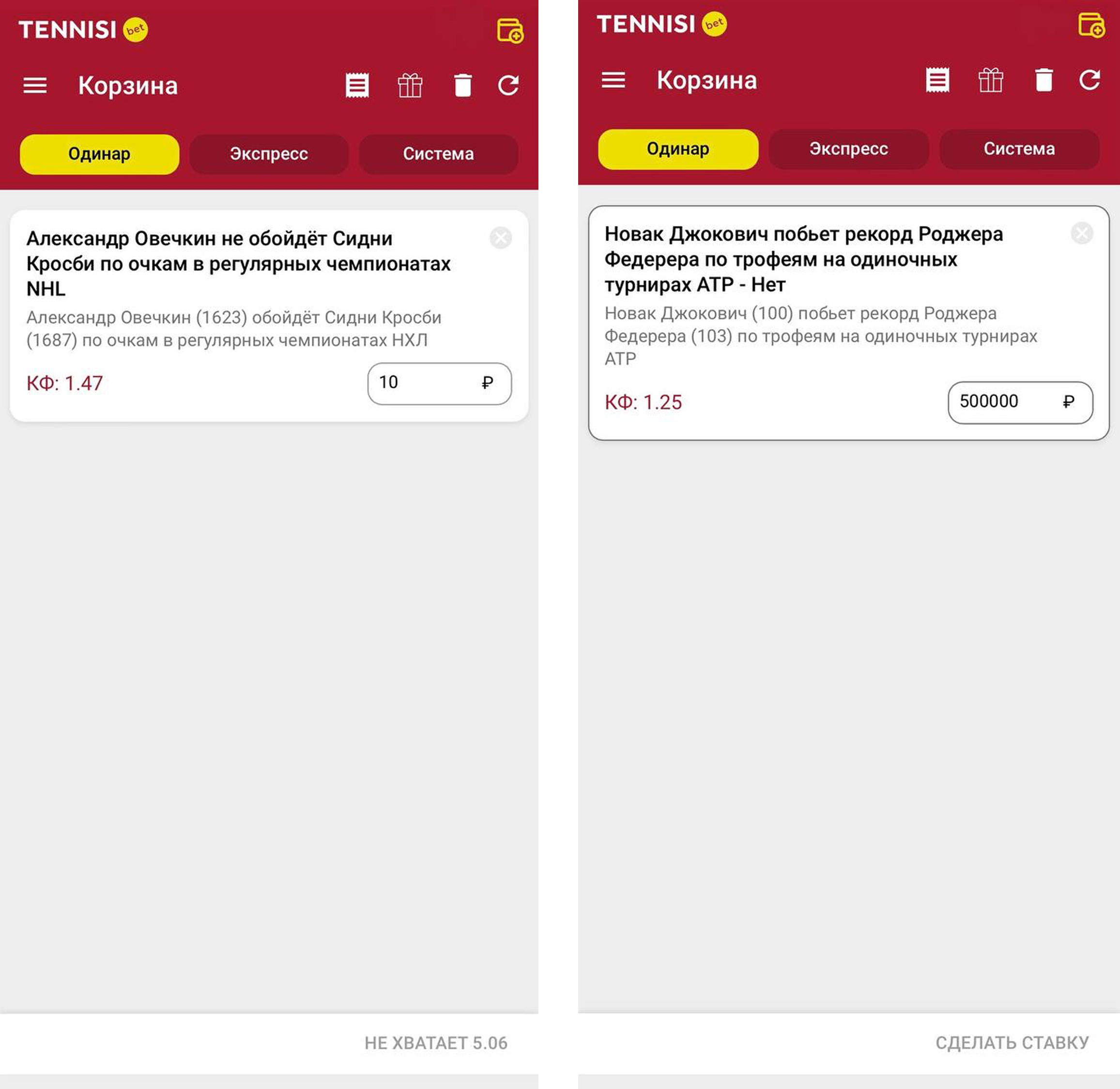 Минимальная ставка в БК Tennisi составляет 10 рублей, независимо от типа ставки и события. Максимальная ставка определяется индивидуально и указывается в корзине. Если игрок хочет поставить больше установленного лимита, он может ввести желаемую сумму и нажать кнопку «Крупная ставка». Запрос отправляется оператору Tennisi для подтверждения.
