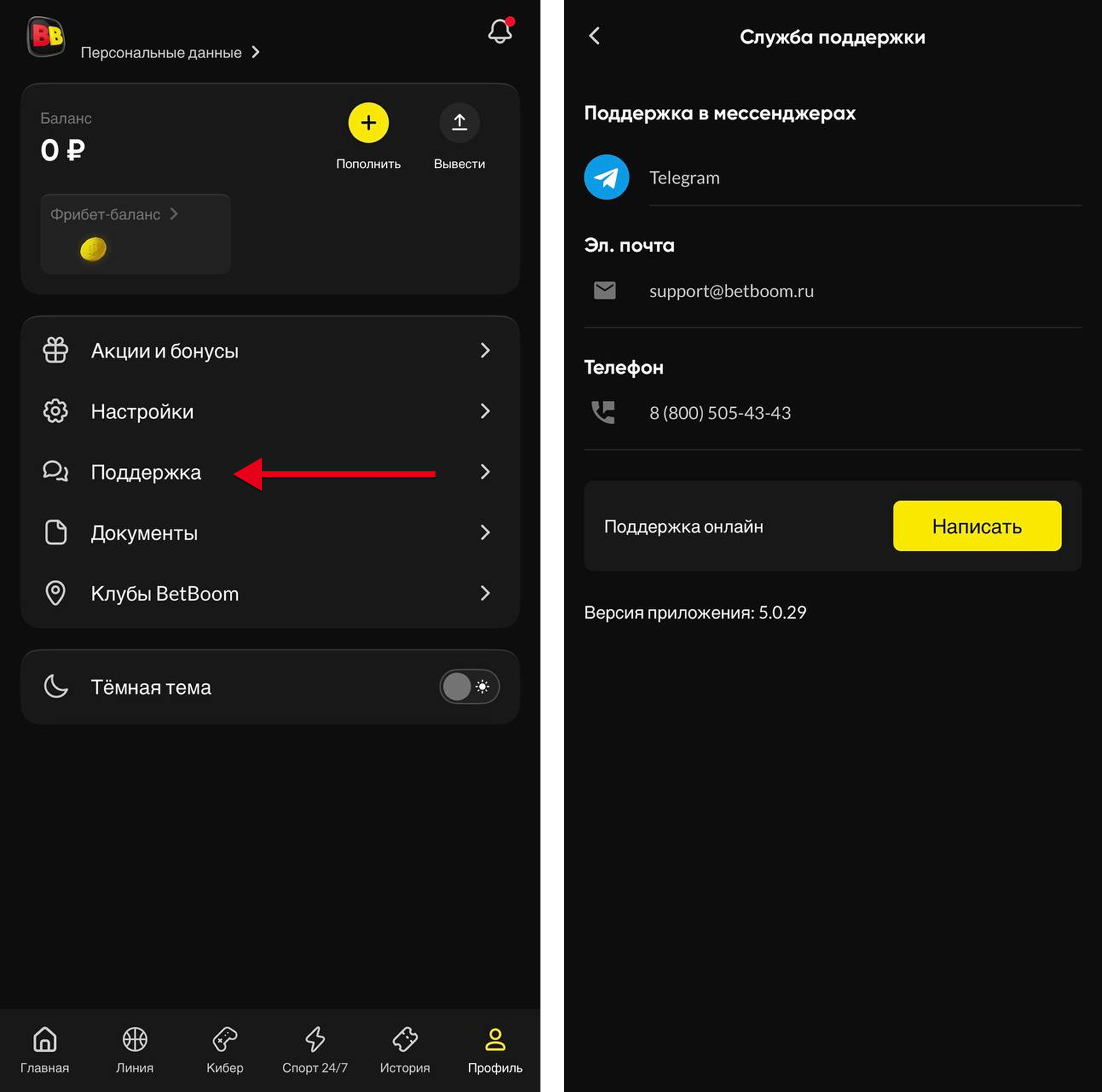 Также вы всегда можете обратиться с интересующими вопросами в поддержку БК. Для этого достаточно перейти в раздел «Поддержка» и выбрать удобный вид связи с оператором.