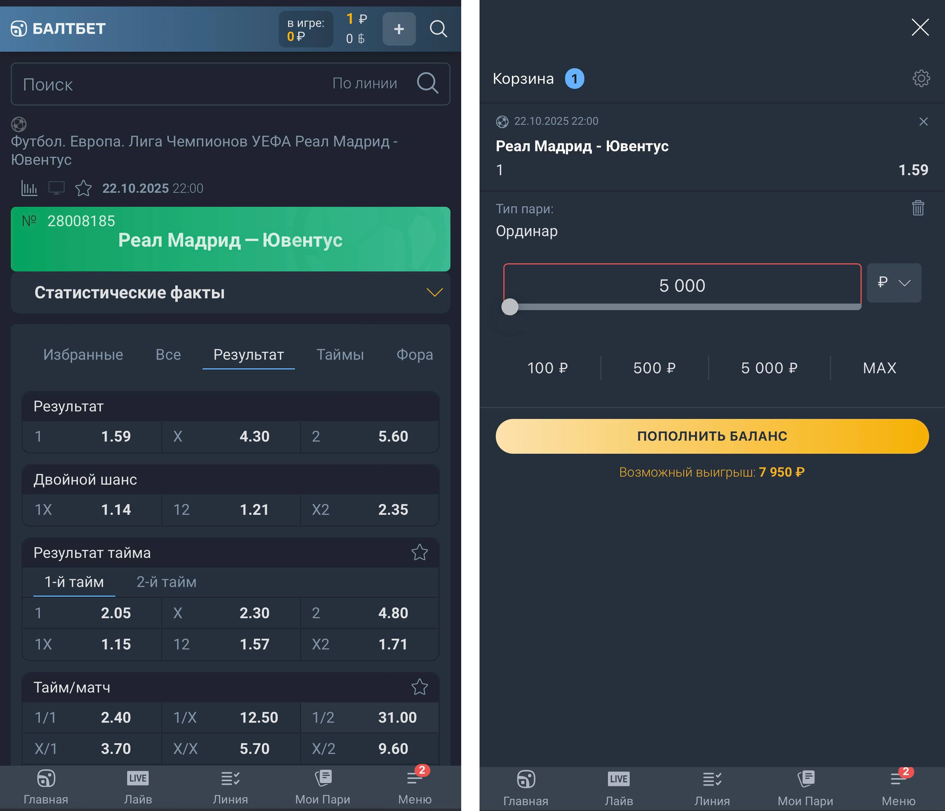 Минимальная сумма ставки в «Балтбет» указывается в купоне, но контора может изменить её размер в зависимости от игры, статистики и количества участников.