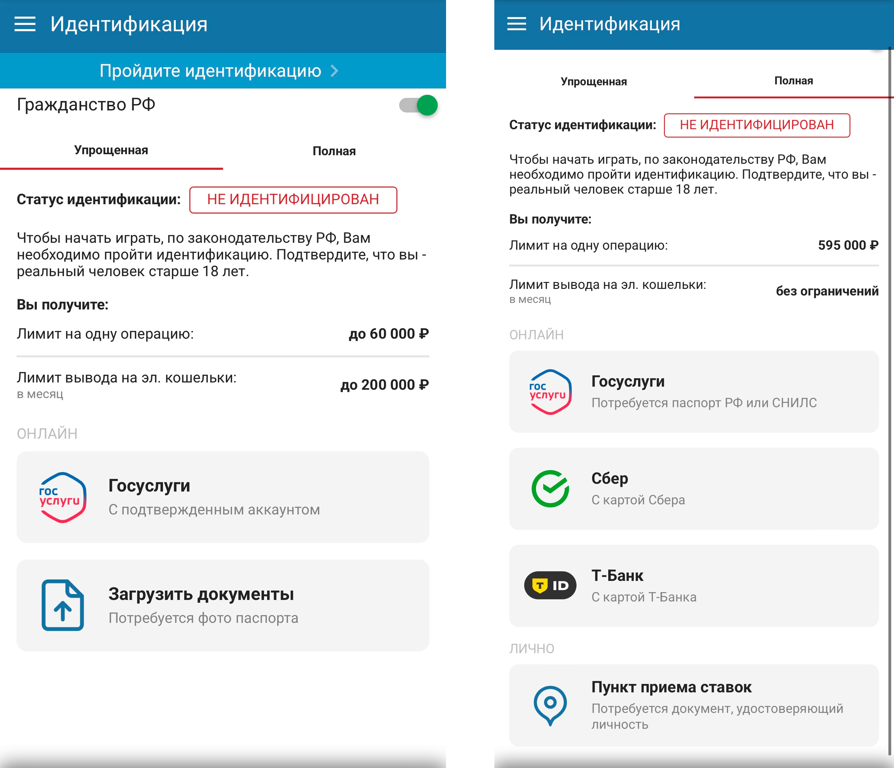 После прохождения упрощенной идентификации игрок может единоразово вносить до 60 000 рублей в зависимости от способа пополнения и до 200 000 рублей в месяц. При полной идентификации лимит на одно пополнение увеличивается до 595 000 рублей в зависимости от способа.