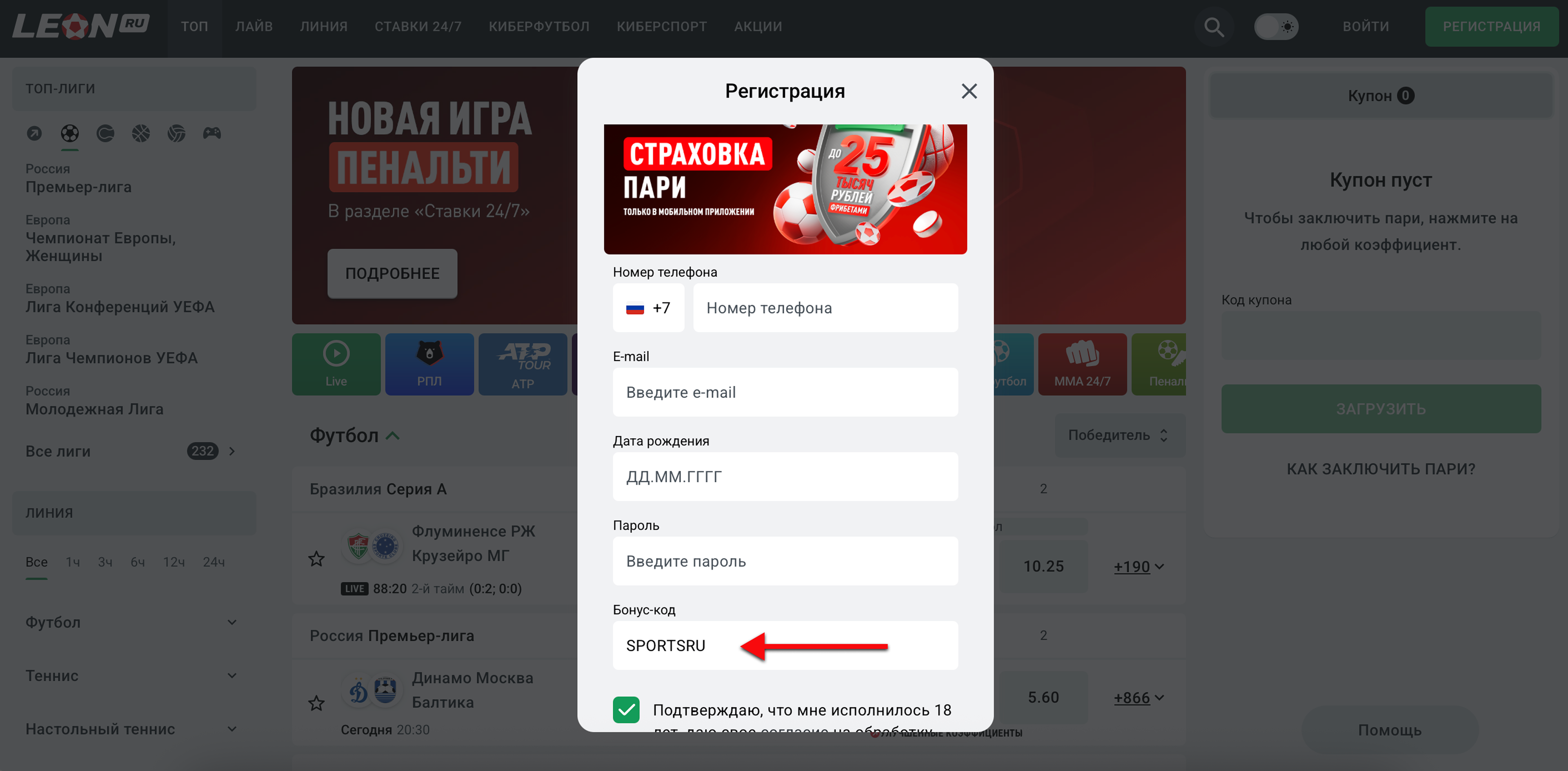 Бонус-код: Для получения специального бонуса при регистрации введите промокод SPORTSRU