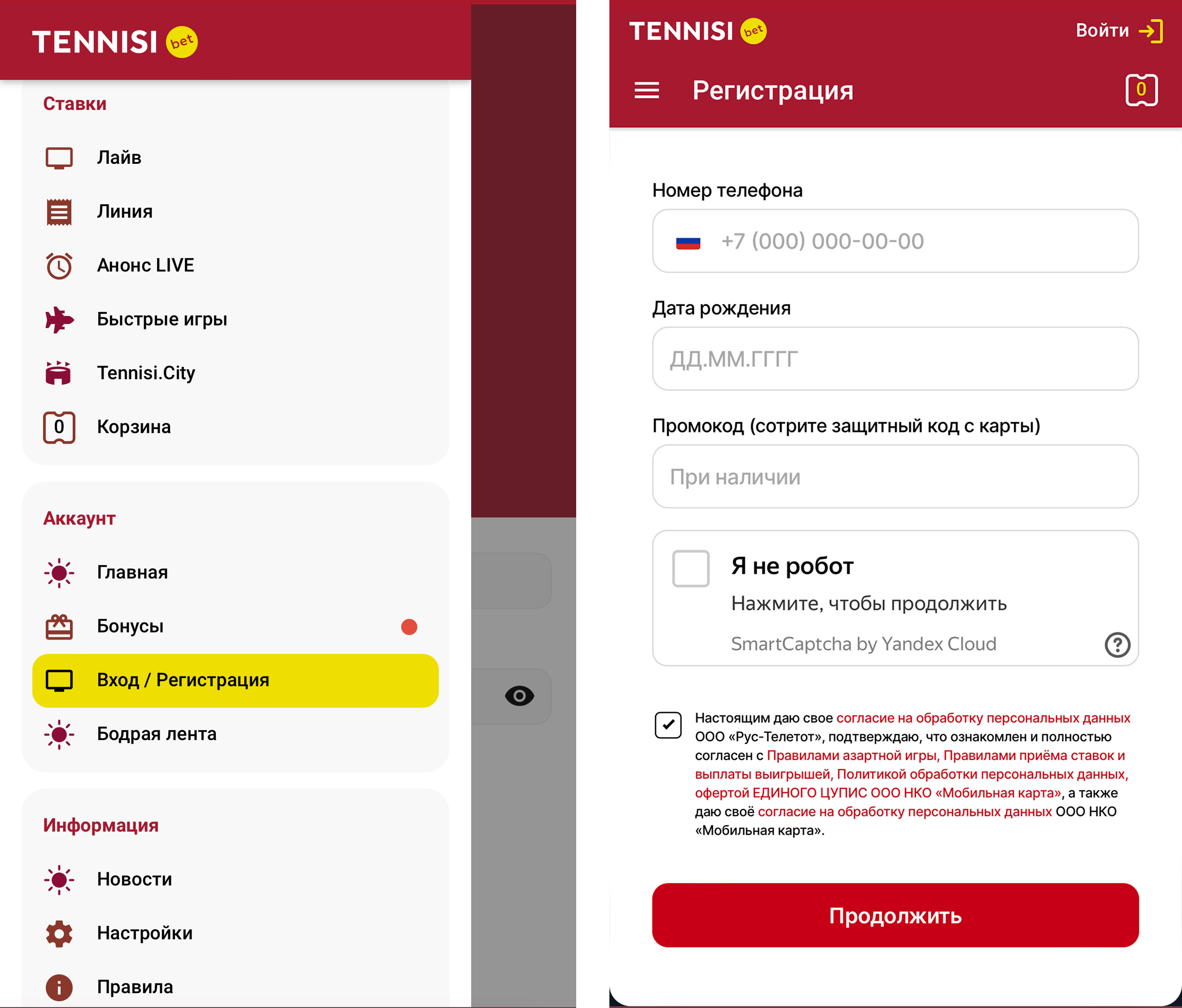 Регистрация в мобильной версии сайта букмекерской компании Tennisi ничем не отличается от процесса регистрации в мобильном приложении букмекера.