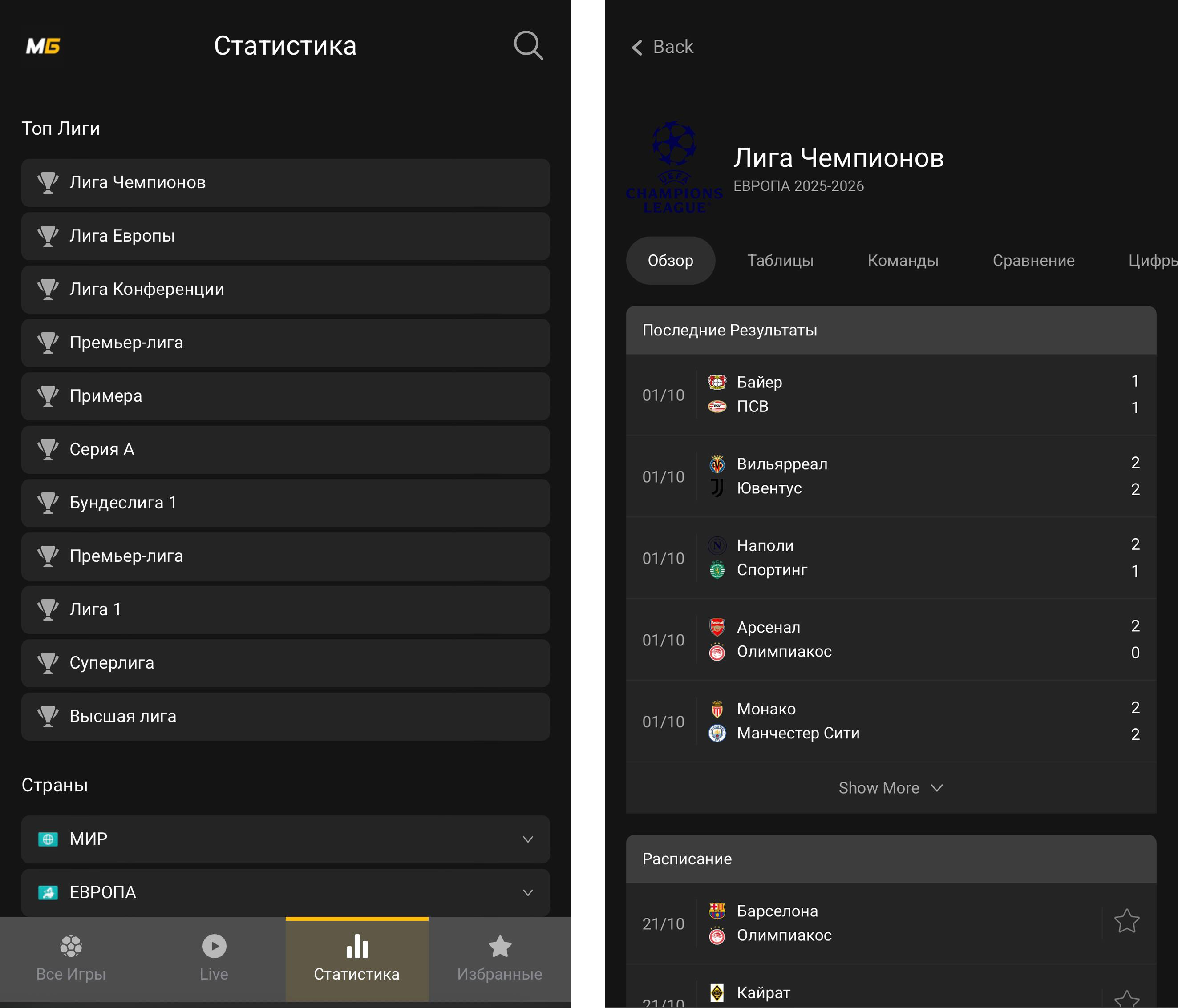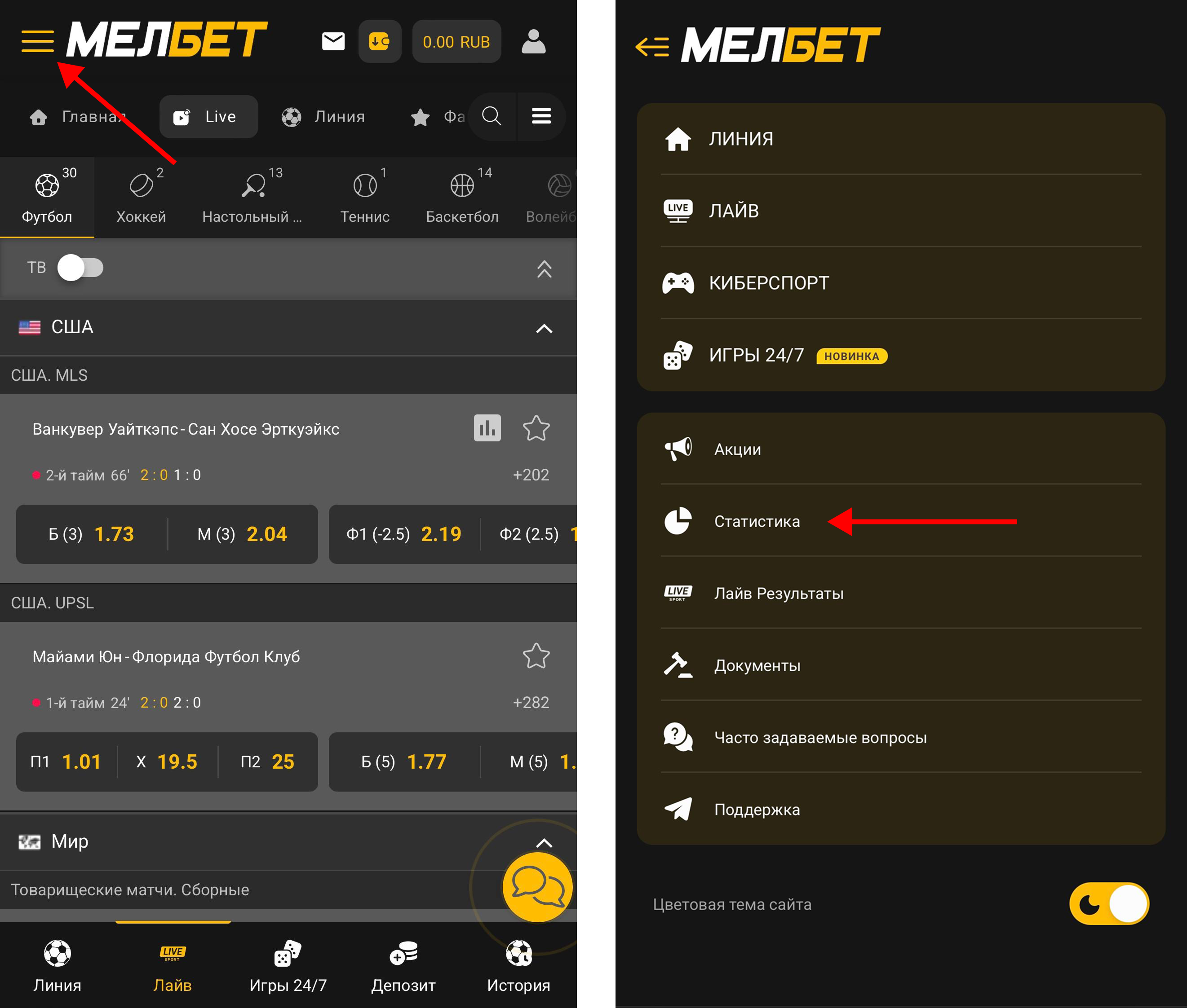 Мобильное приложение БК «Мелбет» также позволяет игрокам просматривать результаты матчей, но имеет несколько отличий в интерфейсе. Чтобы найти нужный раздел, необходимо открыть личный кабинет, нажав на иконку с тремя полосками в левом верхнем углу. Промотав список вниз, вы найдете раздел «Статистика», где сможете воспользоваться фильтрами по виду спорта, стране, чемпионату и дате. Это делает поиск информации интуитивно понятным и быстрым.
