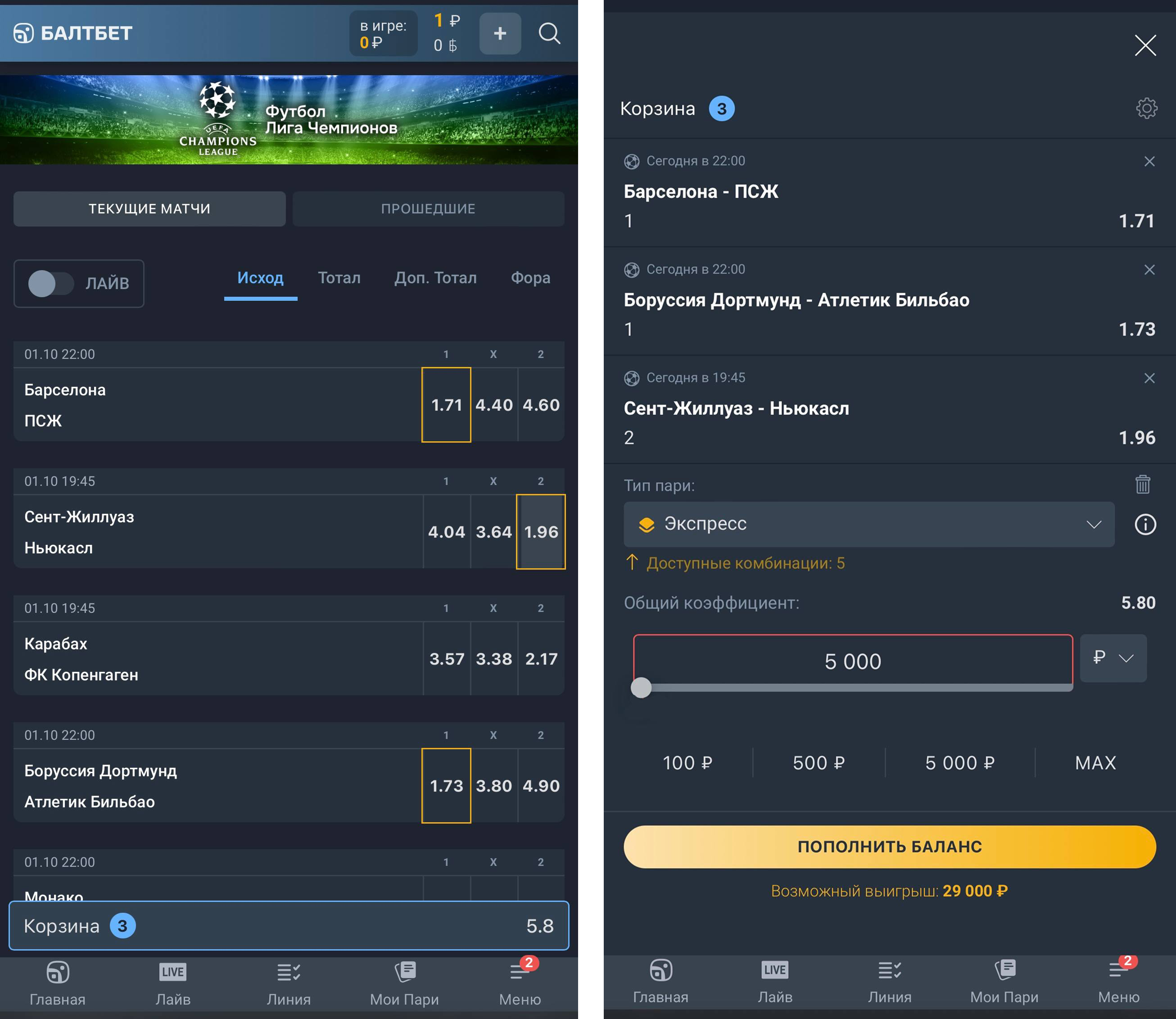 Экспресс-ставка простым языком – выбор результатов из двух или более разных матчей. Важно отметить, что матчи должны быть независимыми друг от друга, ставки на разные исходы в рамках одного матча экспрессом не считаются. Процесс ставок на экспресс в БК «Балтбет» прост, для выигрыша необходимо корректно предсказать все выбранные исходы. не забывайте, что ошибка в одном из событий ведет к проигрышу всего экспресса. Такой подход делает экспресс более комплексным, по сравнению с обычной одиночной ставкой, но потенциальный выигрыш заметно выше, что и делает этот тип ставки особенно привлекательным для игроков с разной степенью подготовки и опыта.
