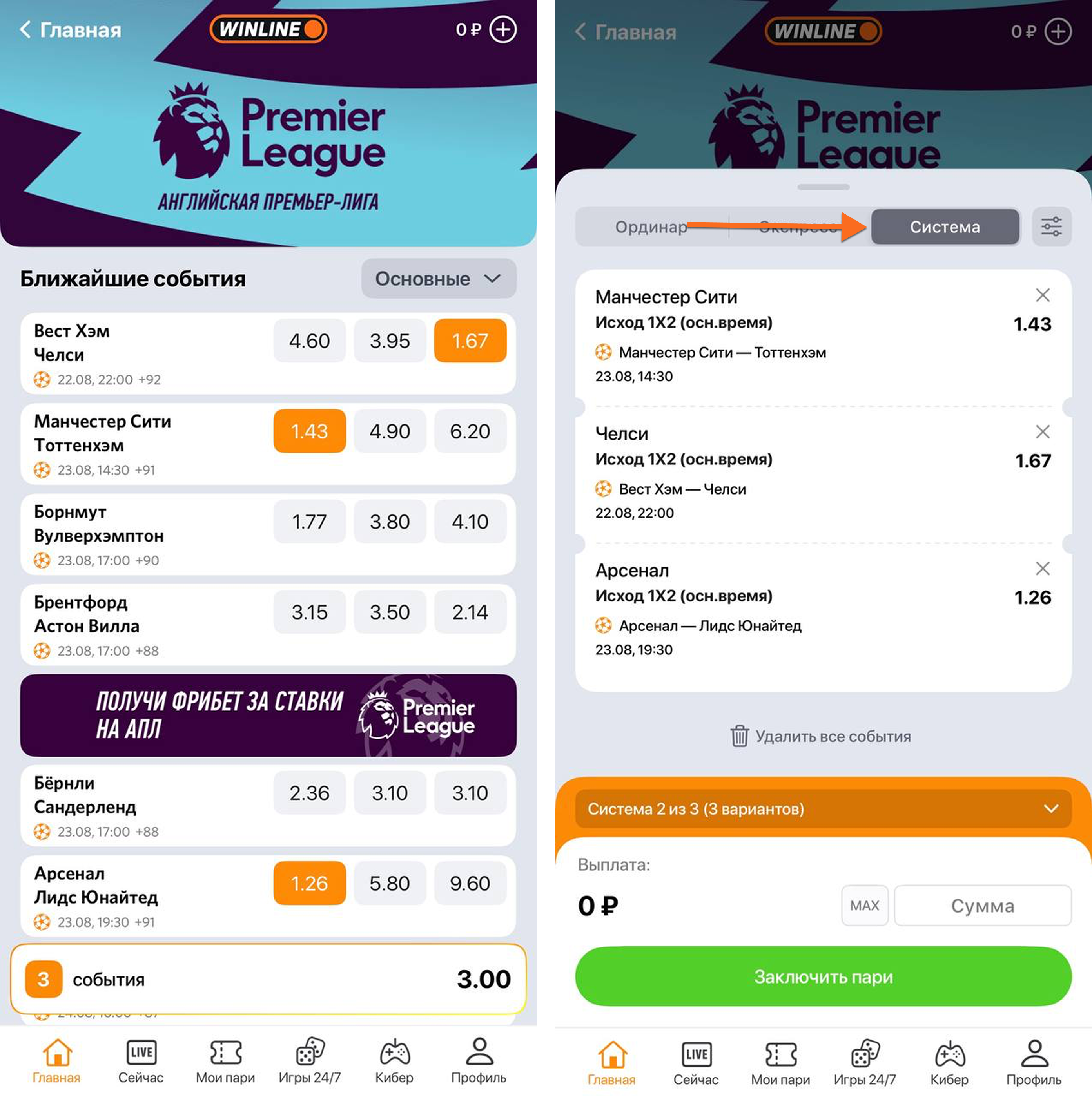 Чтобы разместить ставку системой в БК WINLINE, выполните следующие шаги: