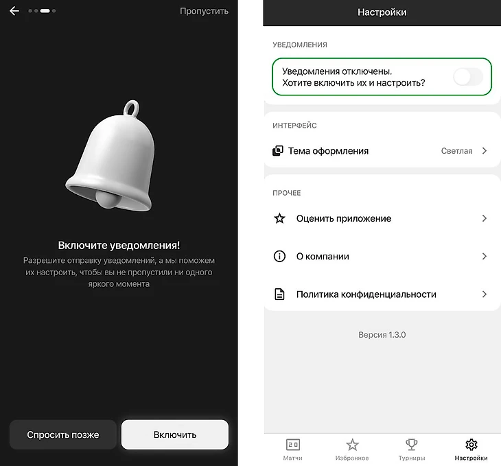 Одна из ключевых возможностей «ГОЛа» — это система уведомлений. Пользователь может выбрать, какие события его интересуют: старт матча, гол, окончание тайма, финальный свисток. Уведомления приходят в виде пушей, что особенно удобно для тех, кто не может постоянно держать приложение открытым, но хочет быть в курсе. Приложение также предлагает выбор между светлой и тёмной темами оформления, что делает его визуально комфортным в любое время суток.
