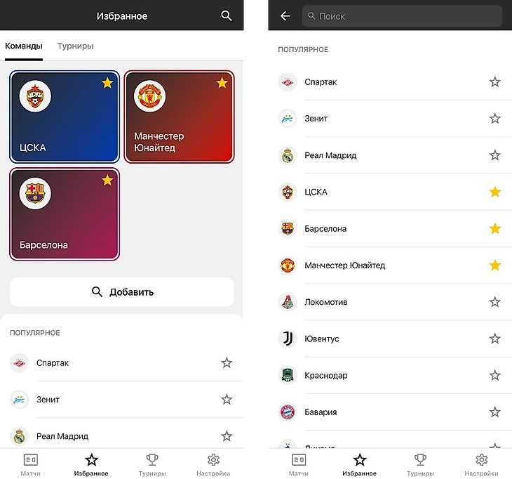 Особого внимания заслуживает вкладка «Избранное». Сюда можно добавлять как конкретные команды, так и целые турниры. Это позволяет формировать персонализированную ленту — все самые важные для пользователя события отображаются в одном месте. Также, в отличие от многих других сервисов, «ГОЛ» предлагает не просто фиксированный список популярных турниров, а возможность вручную настраивать свой спортивный поток.