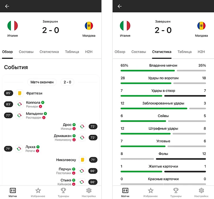 Каждый матч сопровождается подробной информацией: составы команд, данные о голах, заменах, предупреждениях, пенальти и видеоповторах.