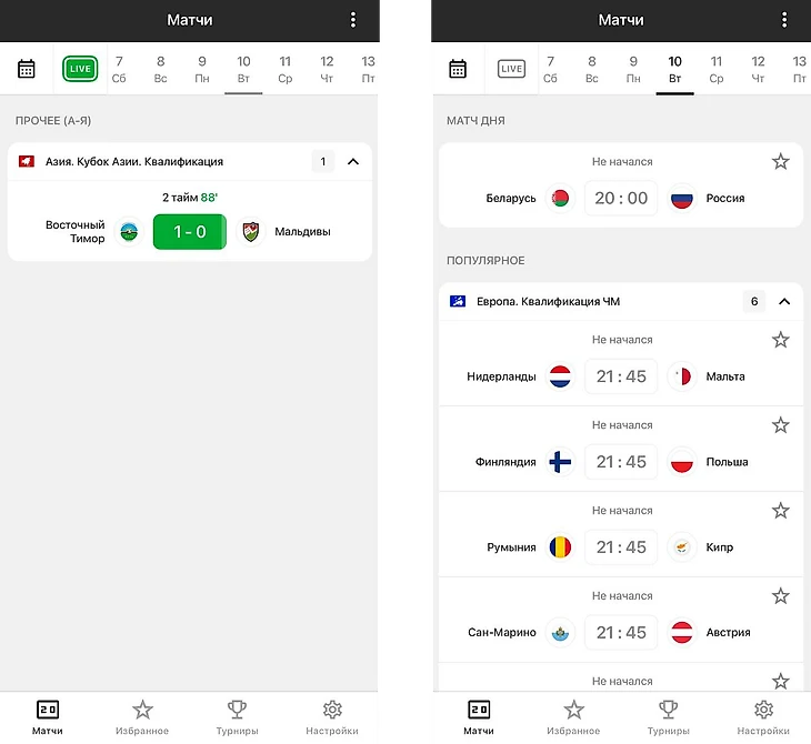 С первых минут использования приложение демонстрирует лаконичный и практичный интерфейс. Стартовая страница открывается на вкладке сегодняшнего дня — здесь собраны все матчи, которые проходят в данный момент или пройдут в течение игрового дня.