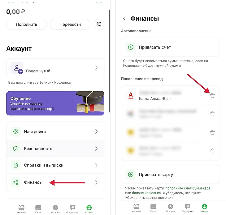 Нажмите на значок корзины рядом с привязанной картой. Это приведет к автоматической отвязке карты.