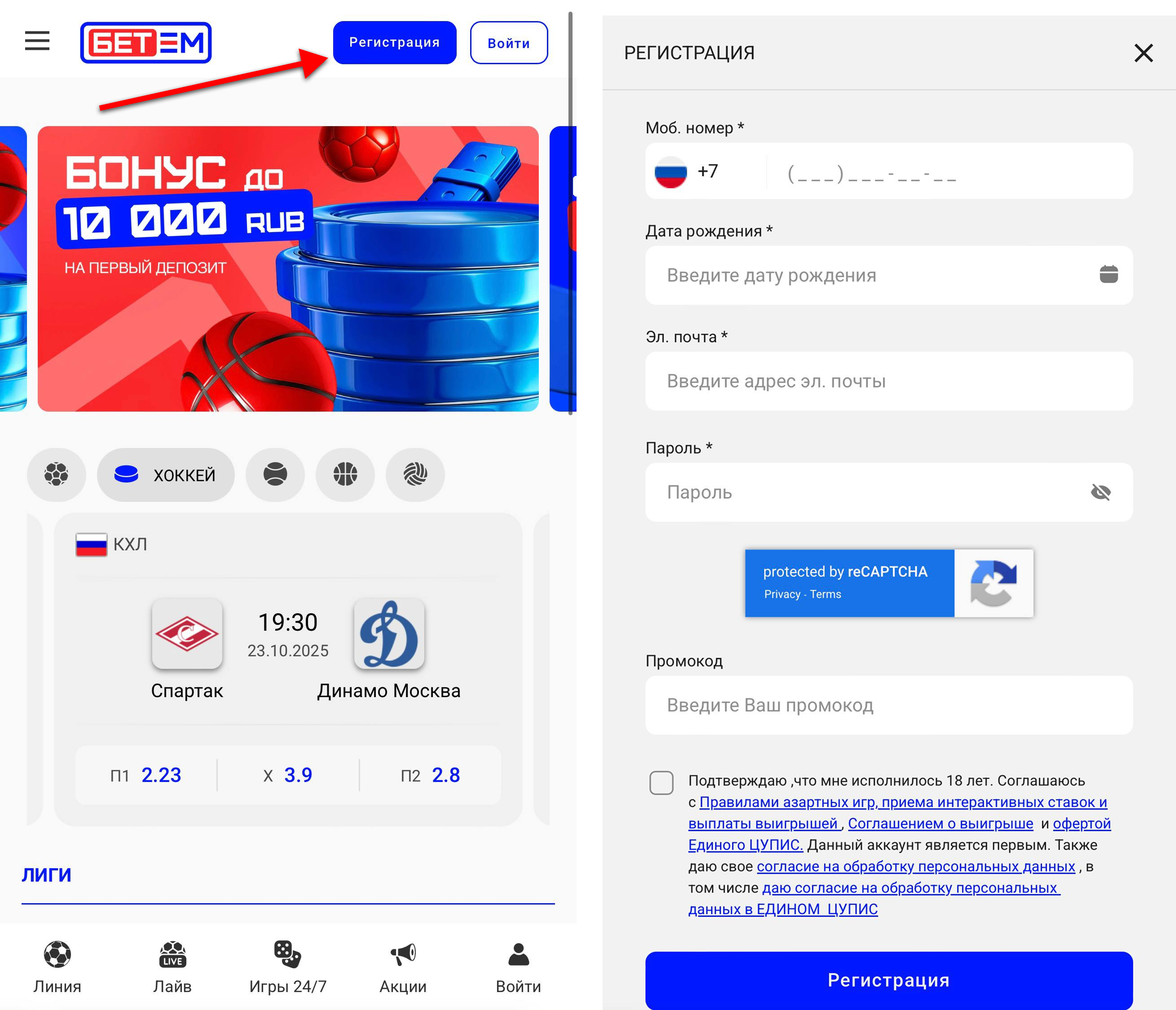 Пройти процедуру регистрации в БК «Бет-М» можно только в онлайн-формате на официальном сайте или в приложении.