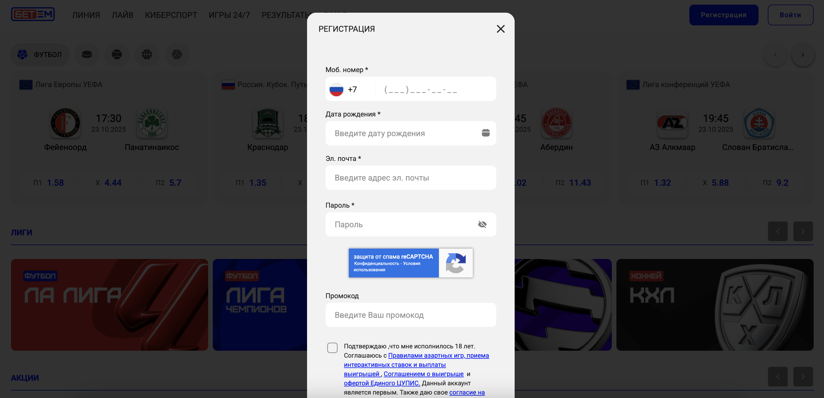 Букмекерская компания «Бет-М» ведет свою деятельность на территории РФ легально и работает в доменной зоне «ru». У нее есть несколько стандартных правил регистрации, которые используются в других легальных БК: