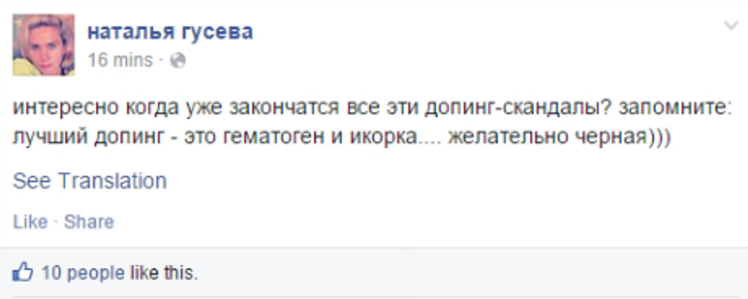 «Интересно, когда уже закончатся все эти допинг-скандалы? Запомните: лучший допинг – это гематоген и икорка... Желательно черная», – написала Сорокина на своей странице в Facebook.