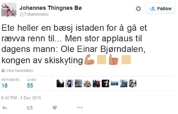 «Лучше есть дерьмо, чем пробежать еще одну такую ужасную гонку. Но нужно похвалить победителя, Уле Эйнара Бьорндалена, короля биатлона», – написал Бо-младший.