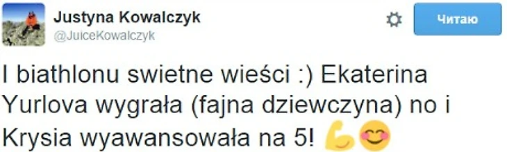 «В биатлоне отличные новости. Екатерина Юрлова (приятная девушка) победила, Кристина Гузик поднялась на 5-е место», – написала Ковальчик.