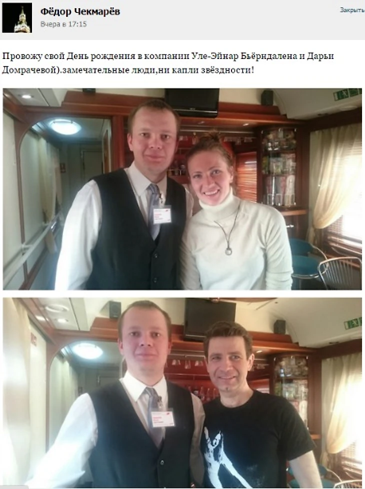 «Провожу свой день рождения в компании Уле Эйнара Бьорндалена и Дарьи Домрачевой. Замечательные люди, ни капли звездности!» – написал Чекмарев.