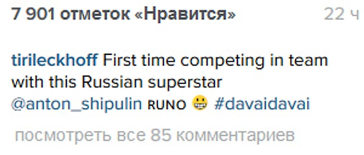 «Впервые выступала в одной команде с этой российской суперзвездой. Антон Шипулин. #давайдавай», – написала Экхофф.
