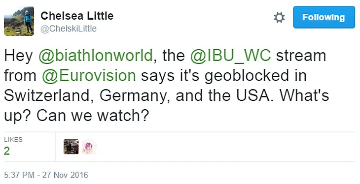 Трансляция смешанной эстафеты из Эстерсунда сегодня недоступна в России, Германии, США, Швейцарии.