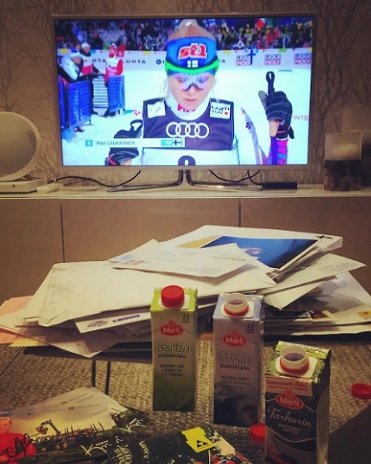 «В восторге от того, что наблюдаю за выступлением Мари Лаукканен на чемпионате мира в Лахти. Держу пальцы «крестиком» за нее и наших парней. У меня есть напитки для любого развития событий», – написала Мякяряйнен.