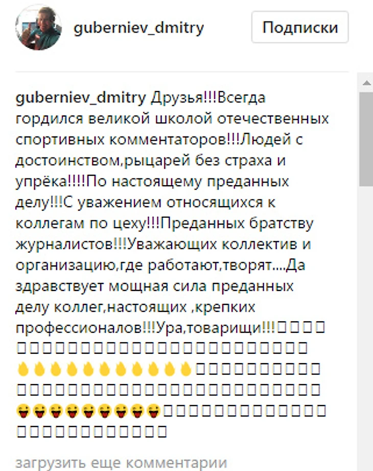 «Друзья! Всегда гордился великой школой отечественных спортивных комментаторов. Людей с достоинством, рыцарей без страха и упрека. По настоящему преданных делу.