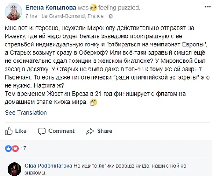 У Мироновой был заезд в десятку. У Старых не было даже в топ-40 к тому же ей закрыт Пхенчхан-2018. То есть даже гипотетически «ради олимпийской эстафеты» это не нужно. Нафига ж? Тем временем Жюстин Брезаз в 21 год финиширует с флагом на домашнем этапе Кубка мира», – написала Копылова.