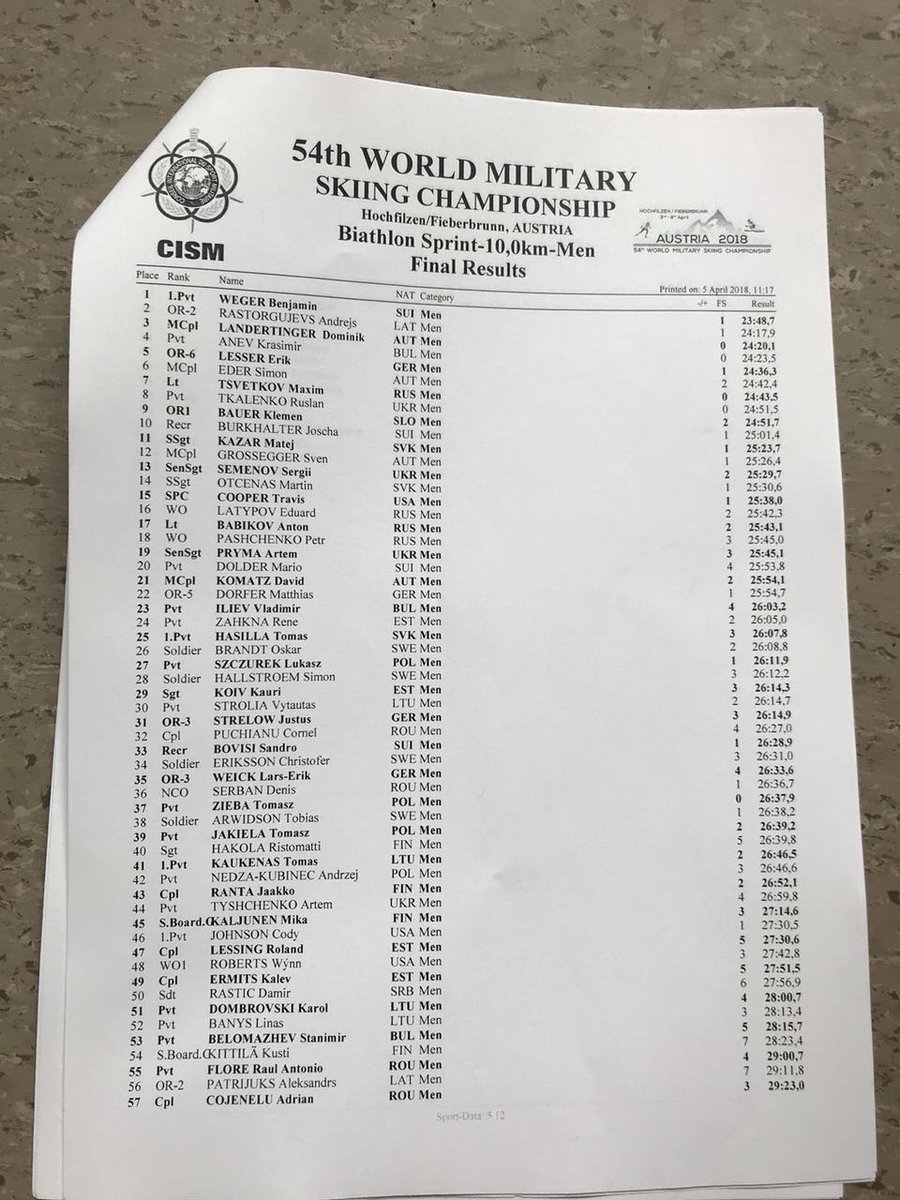 Чемпионат мира среди военнослужащих. Спринт. Вегер победил, Расторгуев – 2-й, Ландертингер – 3-й, Цветков – 7-й, Бабиков – 17-й