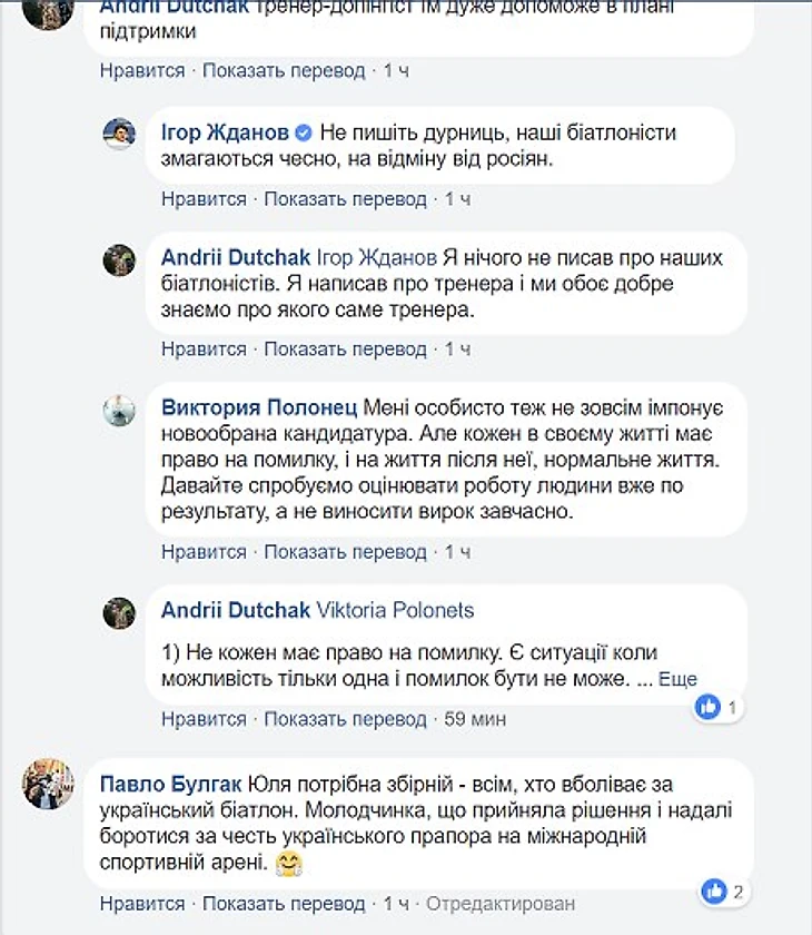 «Не пишите глупостей, наши биатлонисты соревнуются честно, в отличие от россиян», – ответил на это Жданов в комментариях.