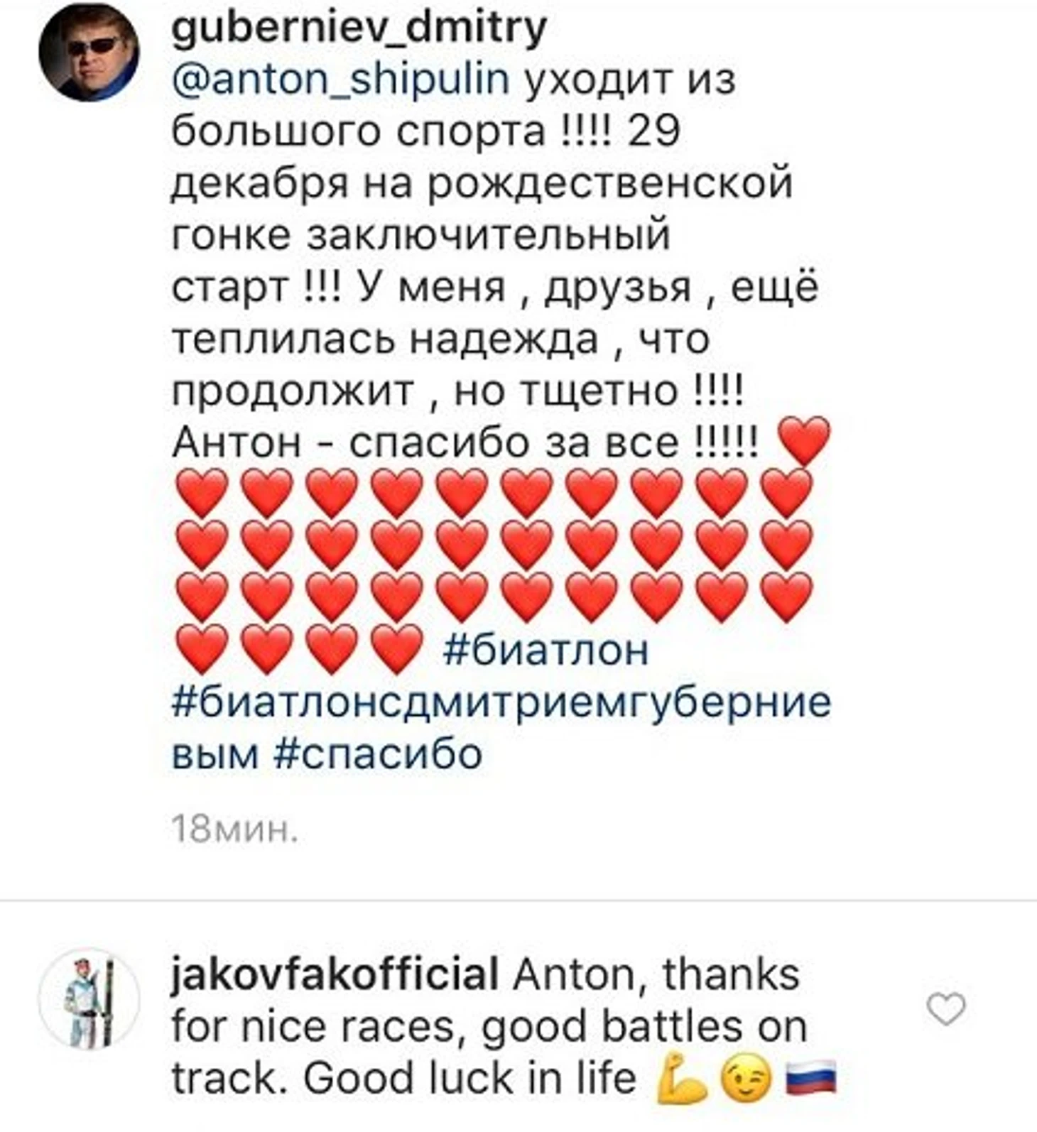 7. Александр Легков: «Сегодня мой друг Антон Шипулин попрощался со спортом... Такова жизнь, тем более – жизнь спортсмена... Спасибо, Антон, за то, что ты сделал в спорте – с тобой биатлон был краше и ближе сердцу каждого болельщика.