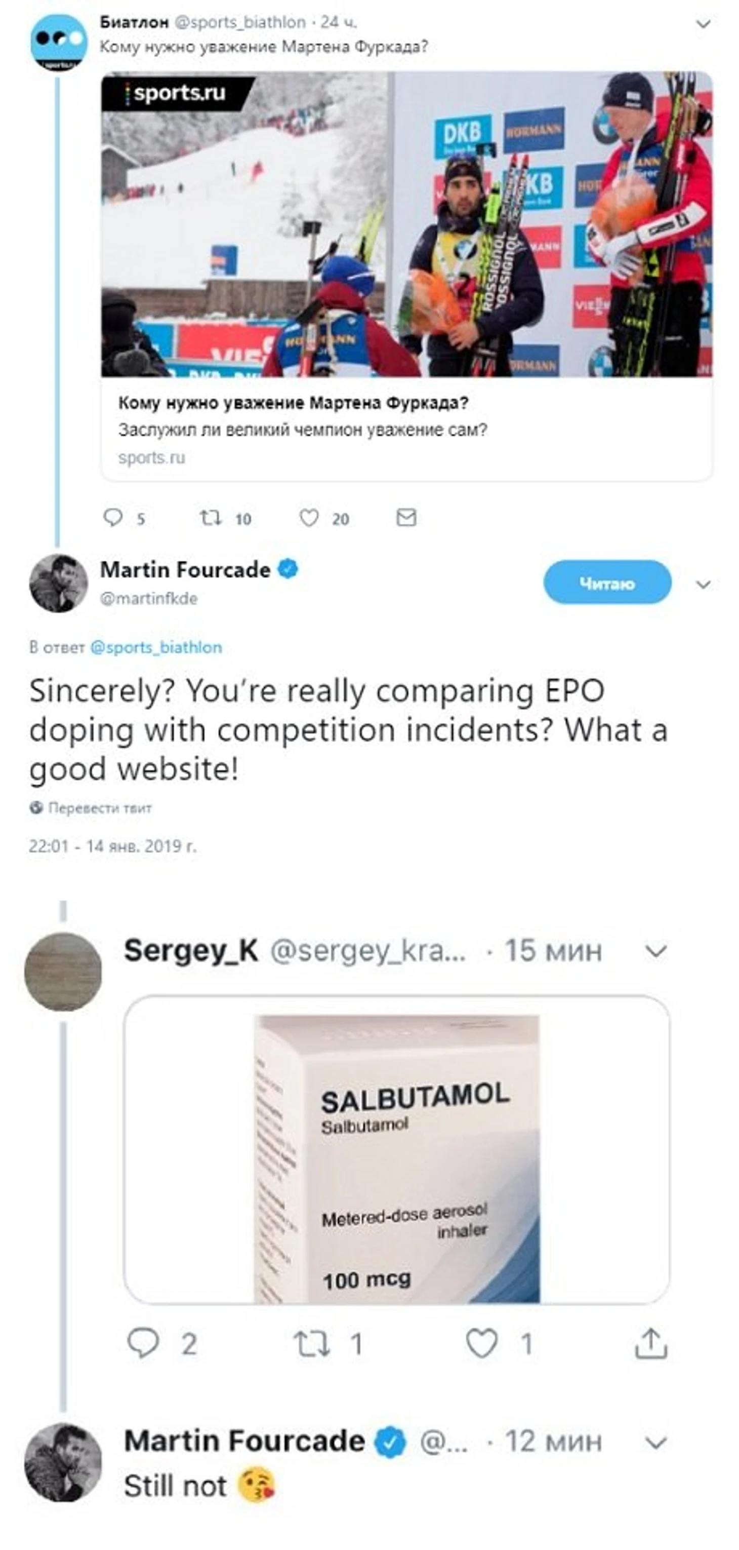 В блоге «На связи. Биатлон» 13 января появился текст с заголовком «Кому нужно уважение Мартена Фуркада?» Автор разобрал случаи неспортивного поведения Фуркада во время гонок. Биатлонист оставил комментарий в твиттере биатлонного раздела Sports.ru.