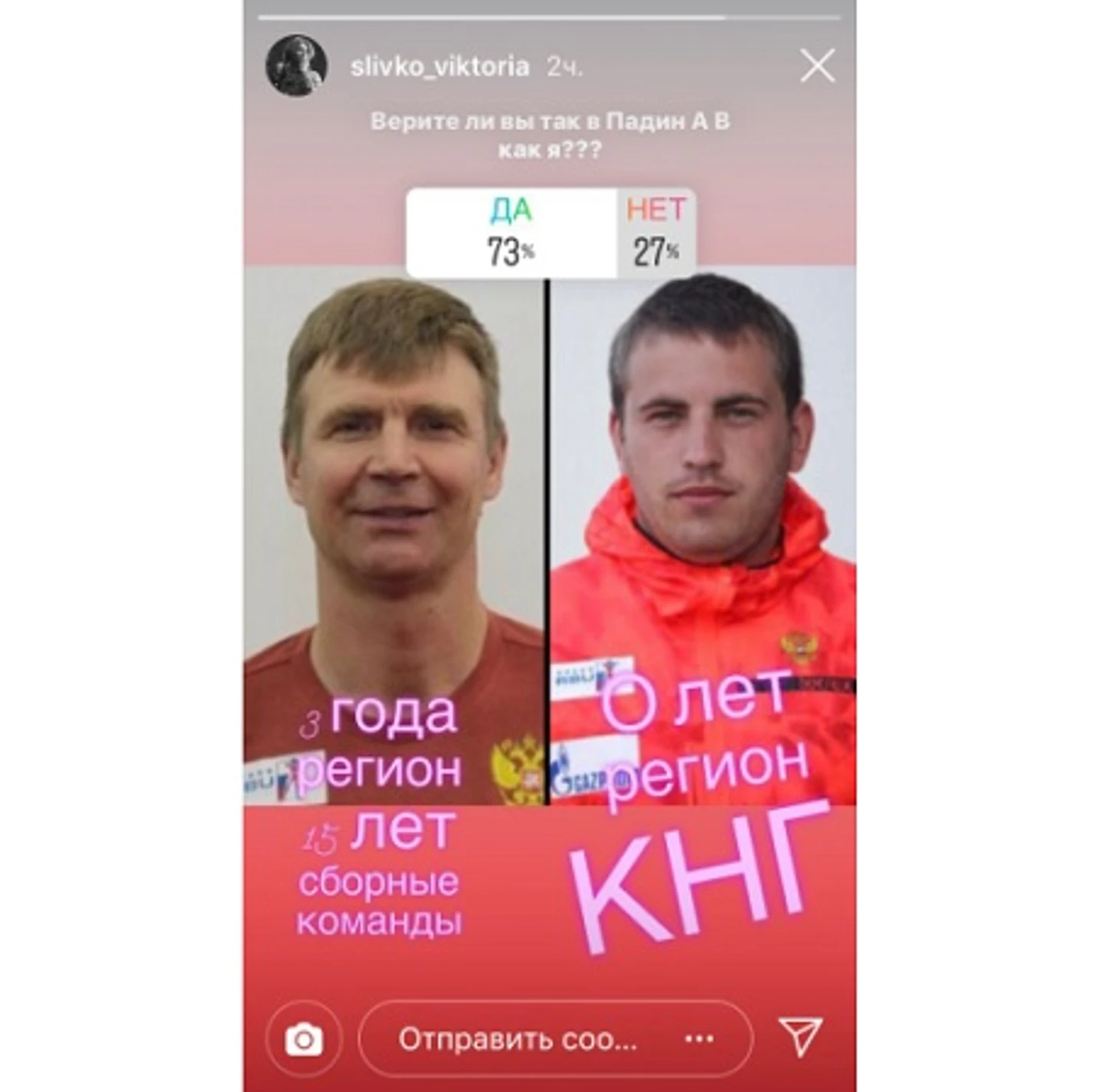 В сториз спортсменка устроила опрос среди болельщиков, спросив: «Верите ли вы в Падина, как и я?» Под вариантом «Нет, не верю» она разместила фото 30-летнего Евгения Куваева, который был назначен помощником Коновалова.