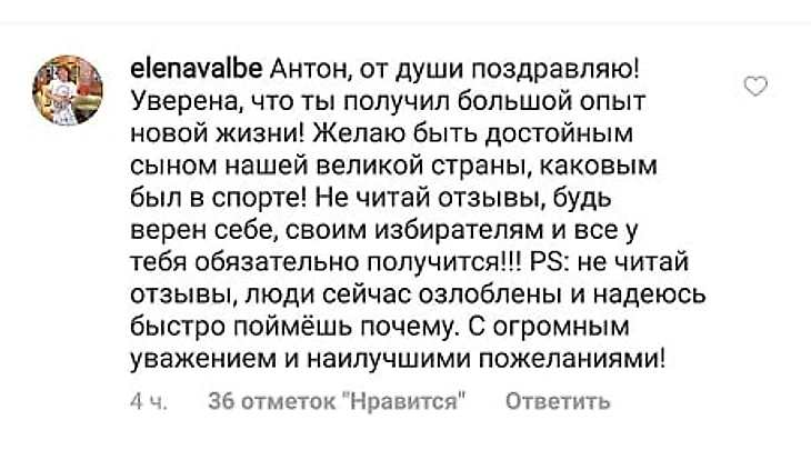 «Антон, от души поздравляю! Уверена, что ты получил большой опыт новой жизни! Желаю быть достойным сыном нашей великой страны, каковым был в спорте!