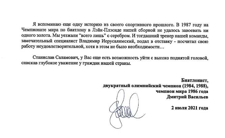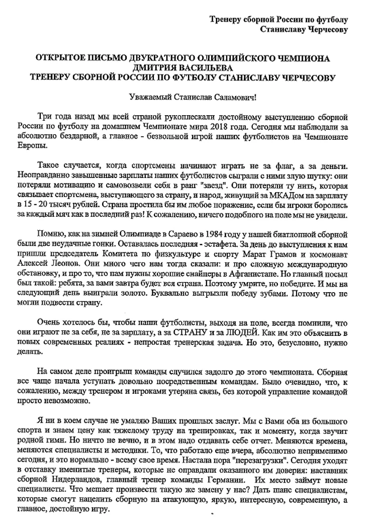 Двукратный олимпийский чемпион по биатлону Дмитрий Васильев написал открытое письмо тренеру сборной России по футболу Станиславу Черчесову с призывом уйти в отставку.